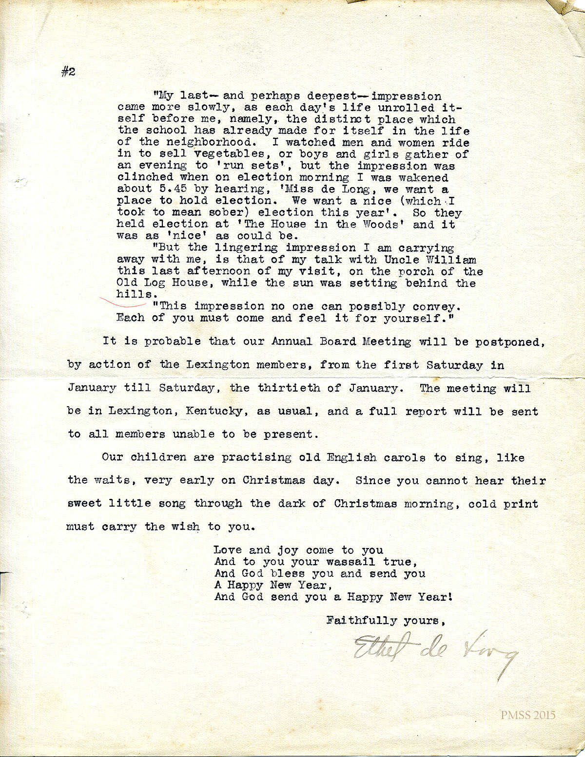 TAGS: Katherine Pettit Correspondence 1914 ; Katherine Pettit ; Ethel de Long ; Pine Mountain Settlement School ; Pine Mountain, KY ; Mrs. J.R. (Bernard) Morton ; Mrs. Black ; Aunt Sal Creech ; drainage ; drying kilns ; Sugar Forest ; Uncle William Creech, Sr. ; maple syrup ; maple sugar ; Farmer McSwain ; flax breaks ; Neighborhood House ; Nurse Clara Davis ; Eve Newman; “sang” (ginseng) ; Farmer’s Institute ; Mary Sweeny ; Kentucky burgoo ; Flurrie Metcalf ; Margaret McCutcheon ; teachers ; pupils ; community ; House in the Woods ; toolhouse ; English carols ;