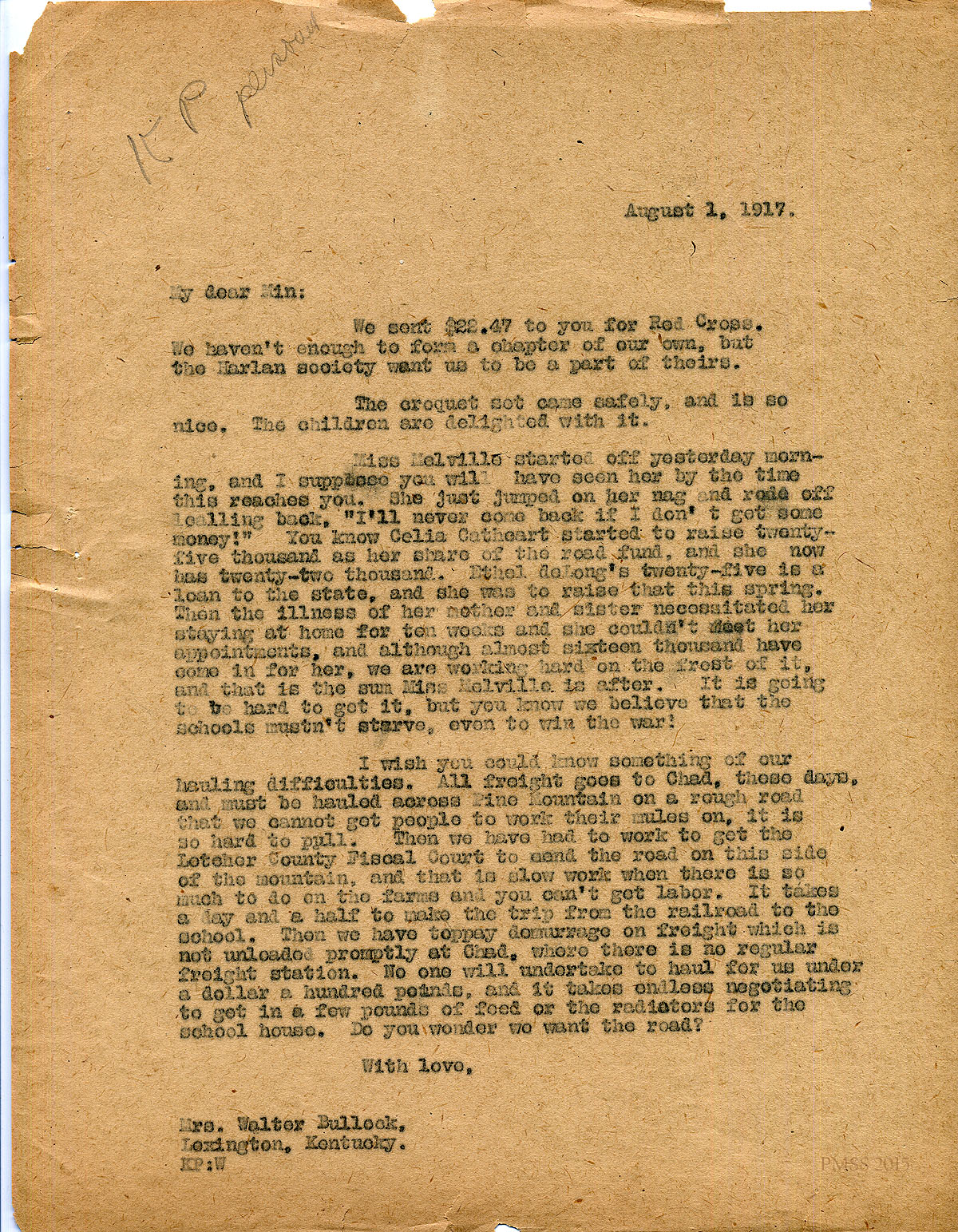 August 1, 1917 [1 page]. [Unsigned] KP to “Min” (Mrs. Walter Bullock), Lexington, KY. Sent money for Red Cross of Harlan; croquet net arrived; fundraising efforts by Miss [Angela] Melville, Celia Cathcart and Ethel de Long; describes hauling and road maintenance difficulties, showing need for new road. [006]