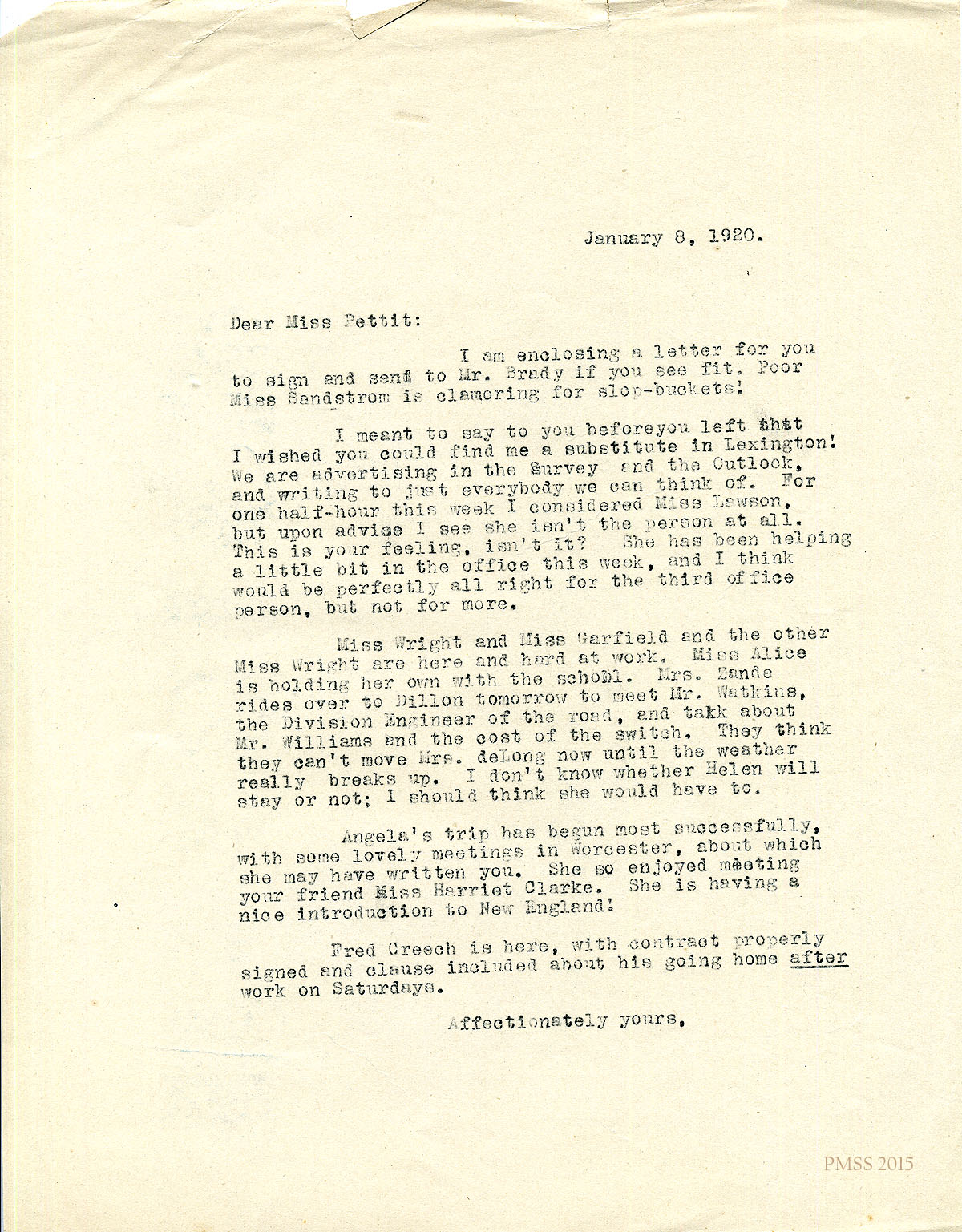 January 8, 1920. [unsigned] to Miss Pettit. Miss Garfield, Misses Wright; Angela Melville trip; Fred Creech. [001]