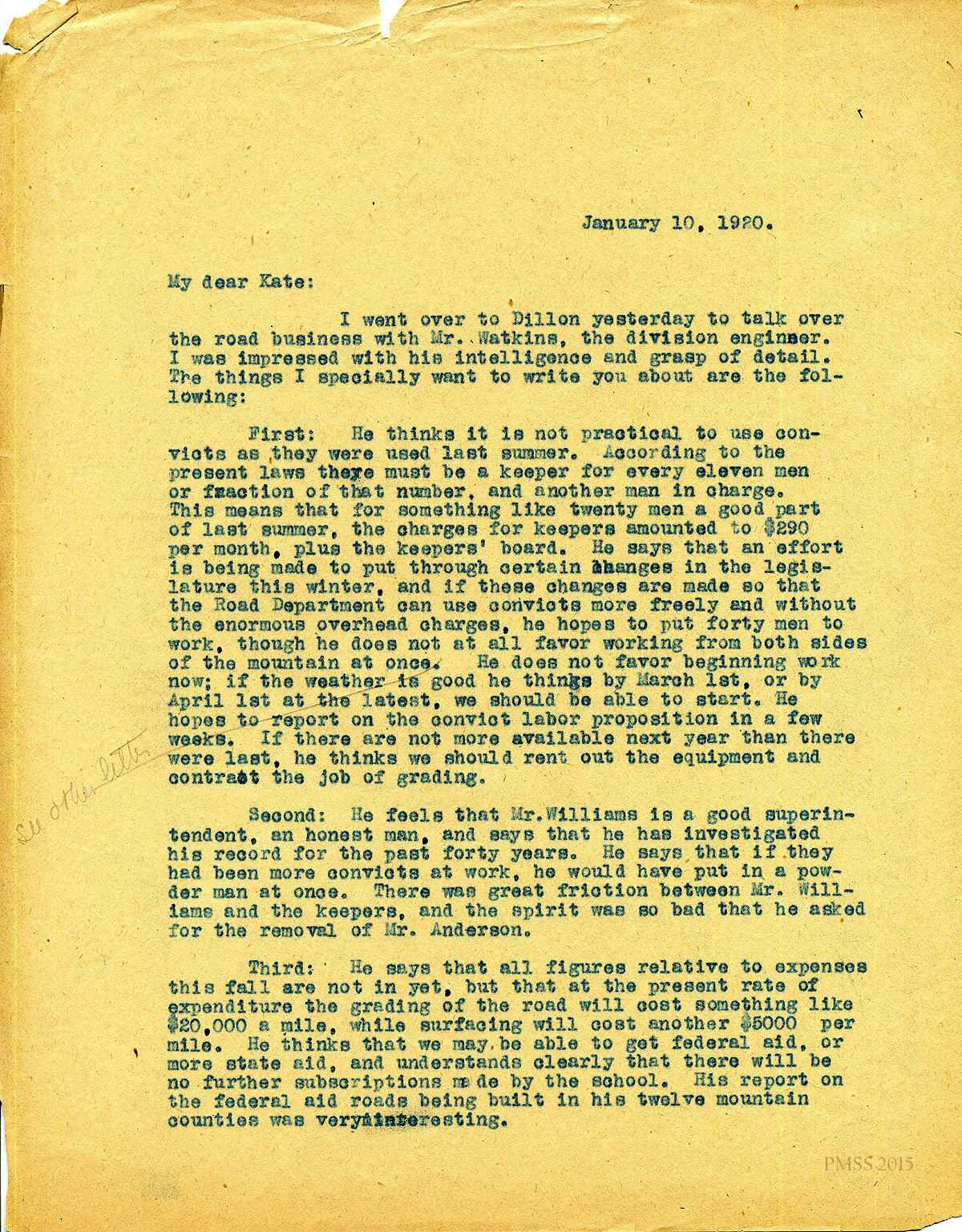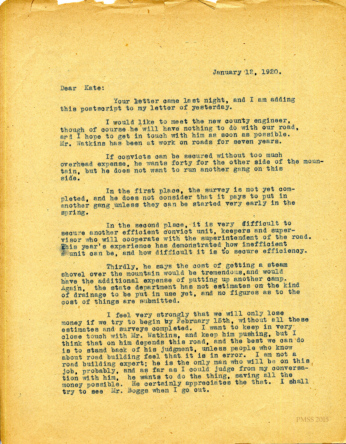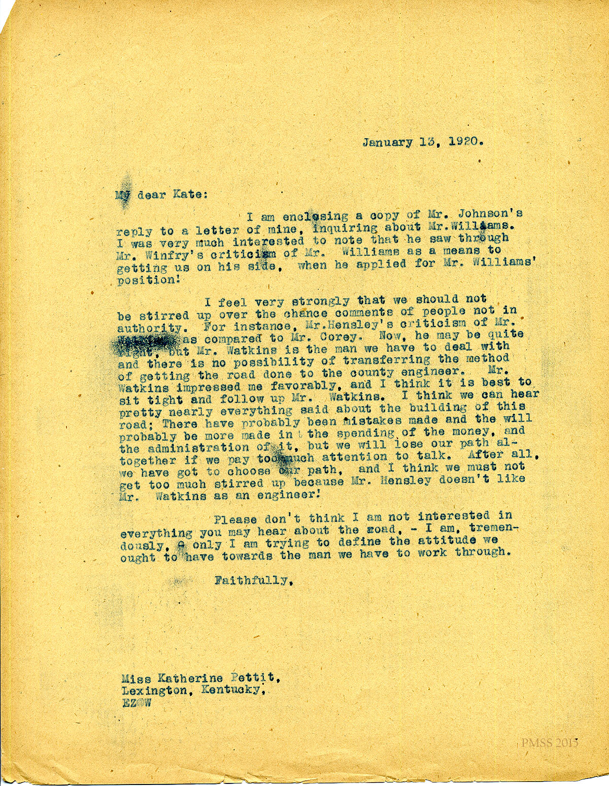 January 12, 1920. [unsigned] EZ to “Kate” Pettit, Lexington, KY. Support for Mr. Watkins, road engineer. [009]