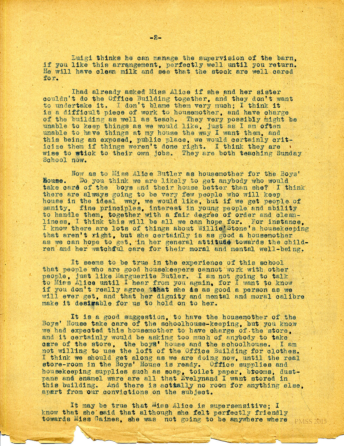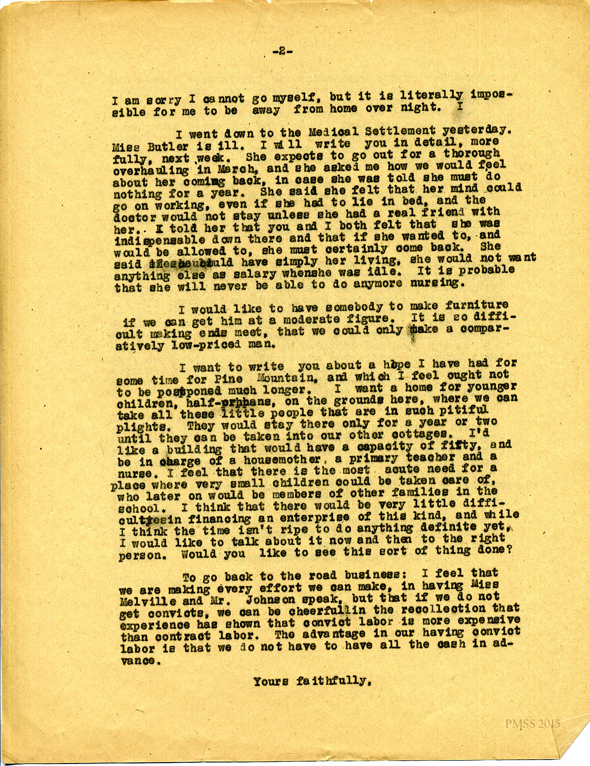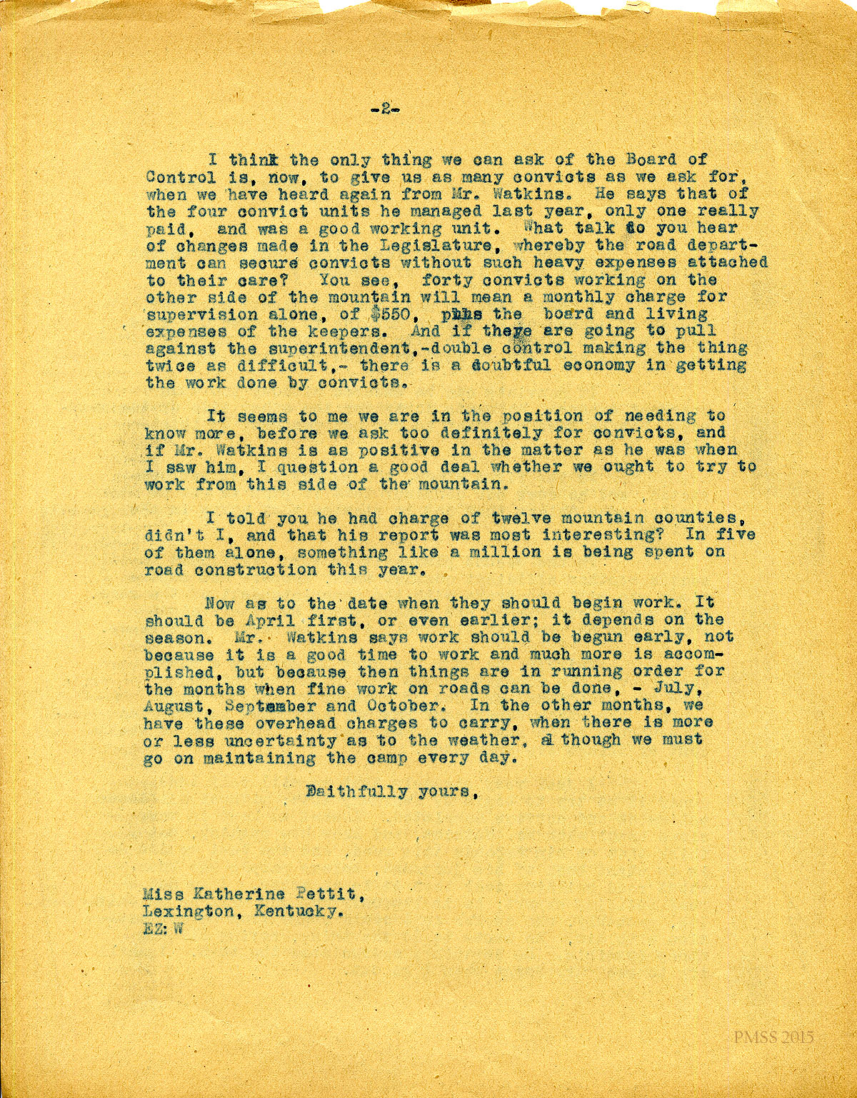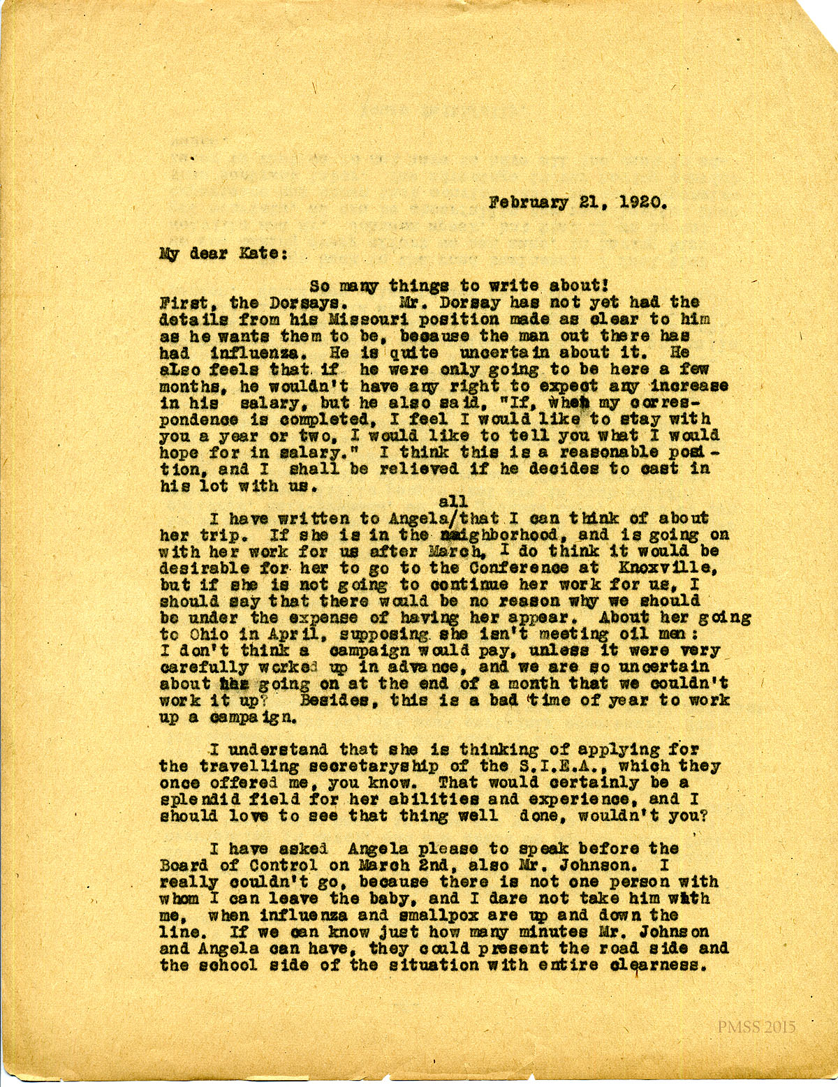 February 21, 1920. [unsigned] to “Kate” Pettit. Mr. Dorsay; Angela [Melville]; Miss Butler’s illness; need children’s home at P.M.; using convict work on the road. [054-055]