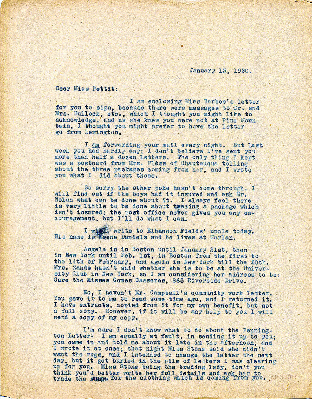 January 20, 1920. [unsigned] to “Kate” Pettit, Lexington, KY. Rehiring Angela [Melville]; fundraising; hiring for extensions work; Alice Butler; workers. [012-014]