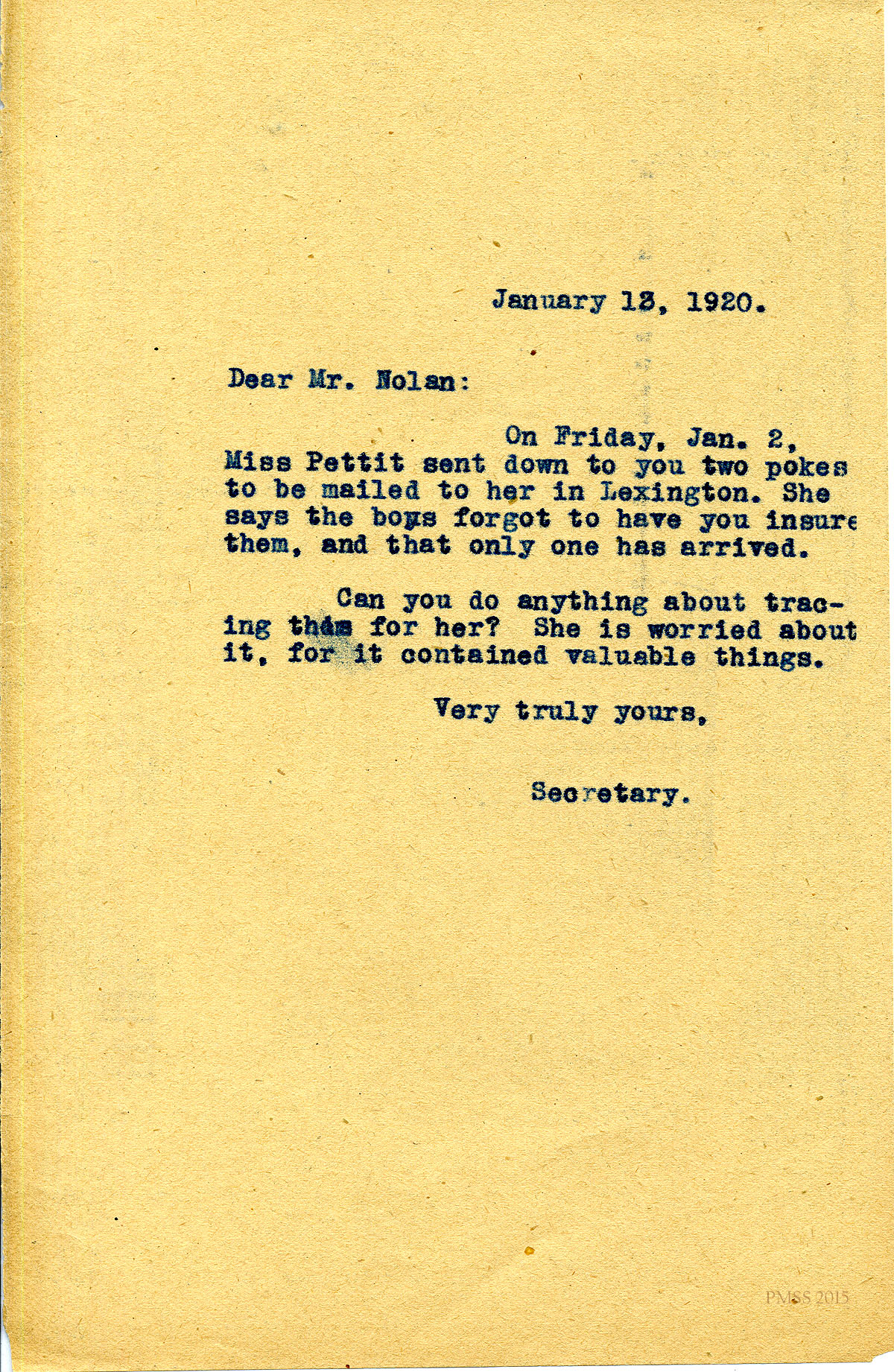 January 13, 1920. Secretary to Mr. Nolan. Tracking “pokes” sent to Miss Pettit. [008]