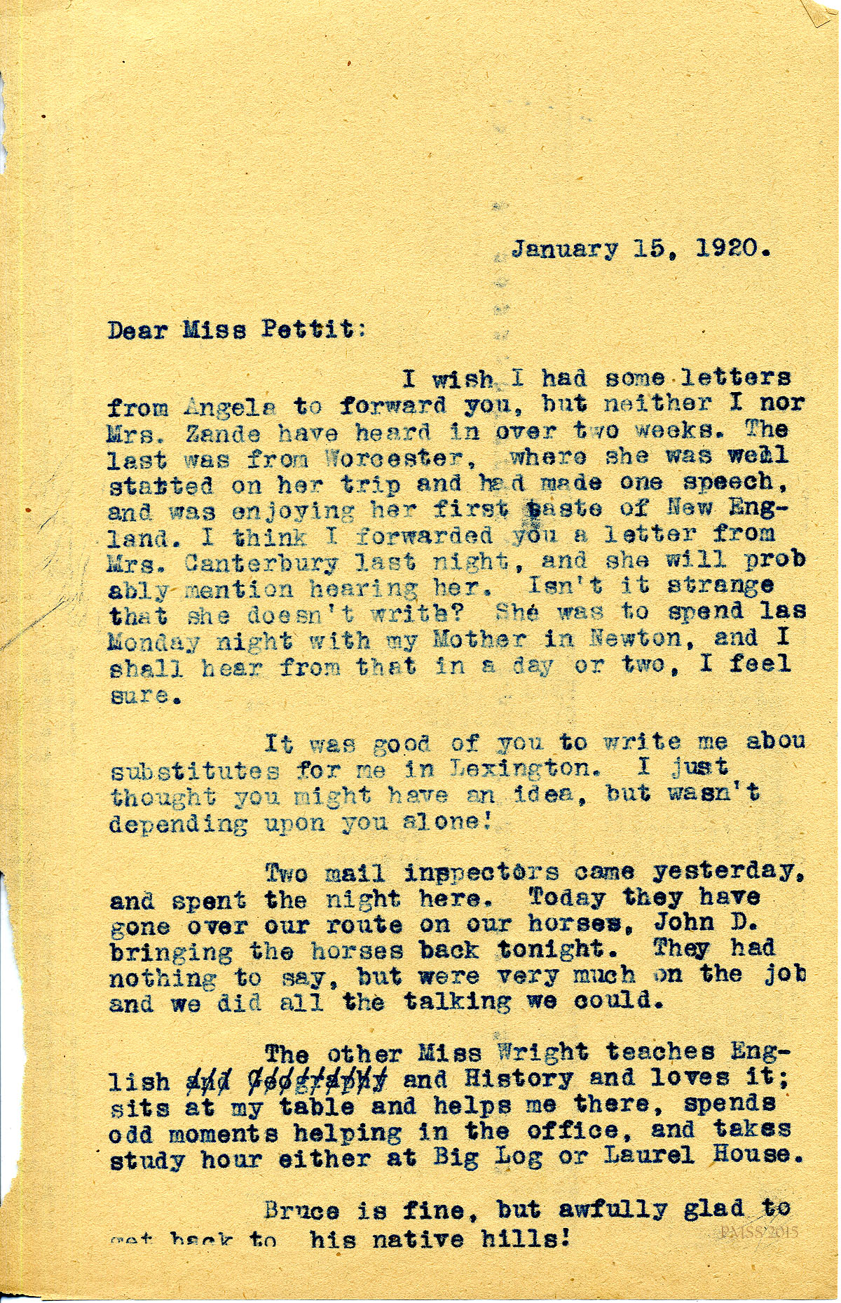 January 15, 1920. [unsigned] to Miss Pettit. Various updates; Miss Wright; mail inspectors. [010-011]