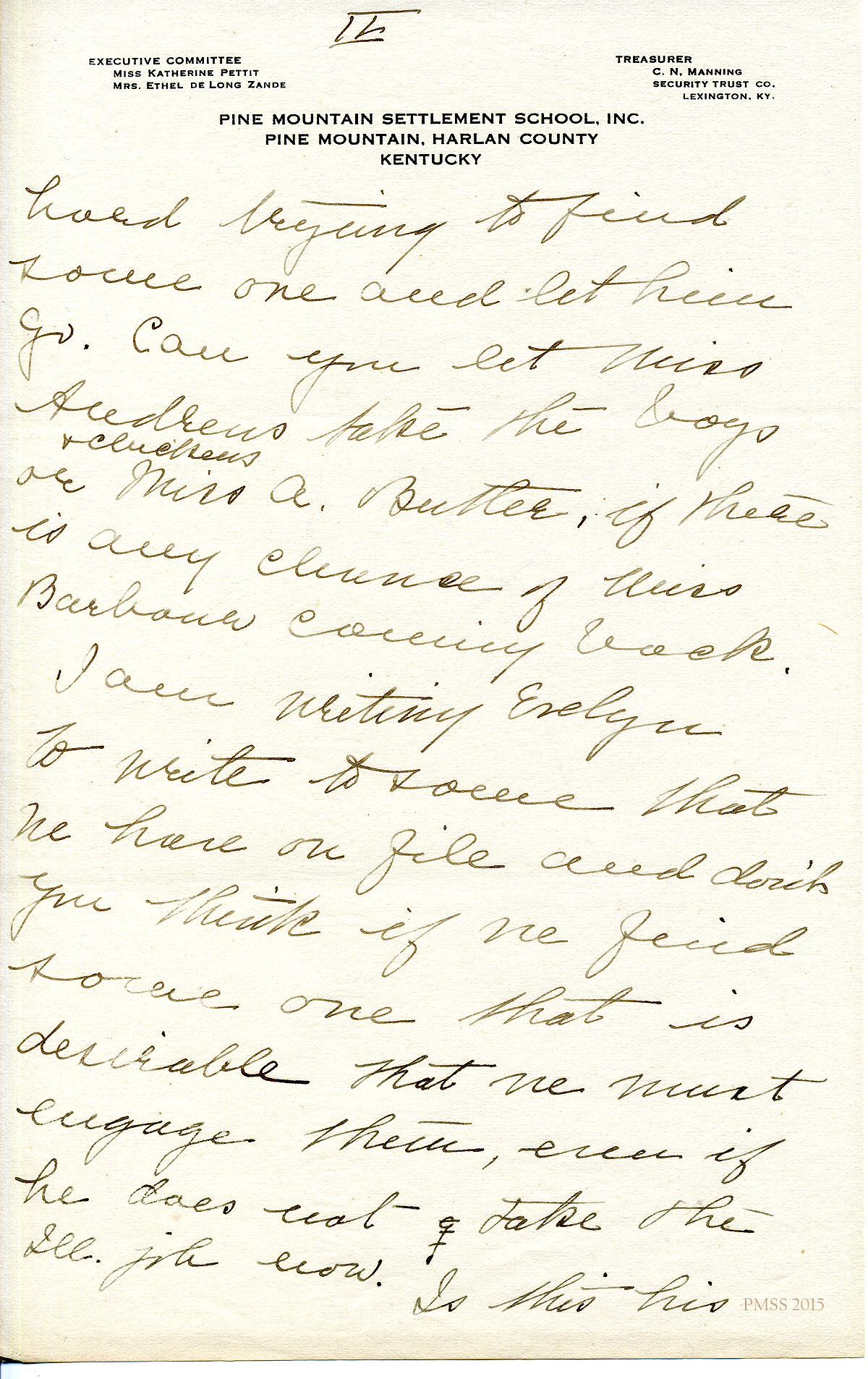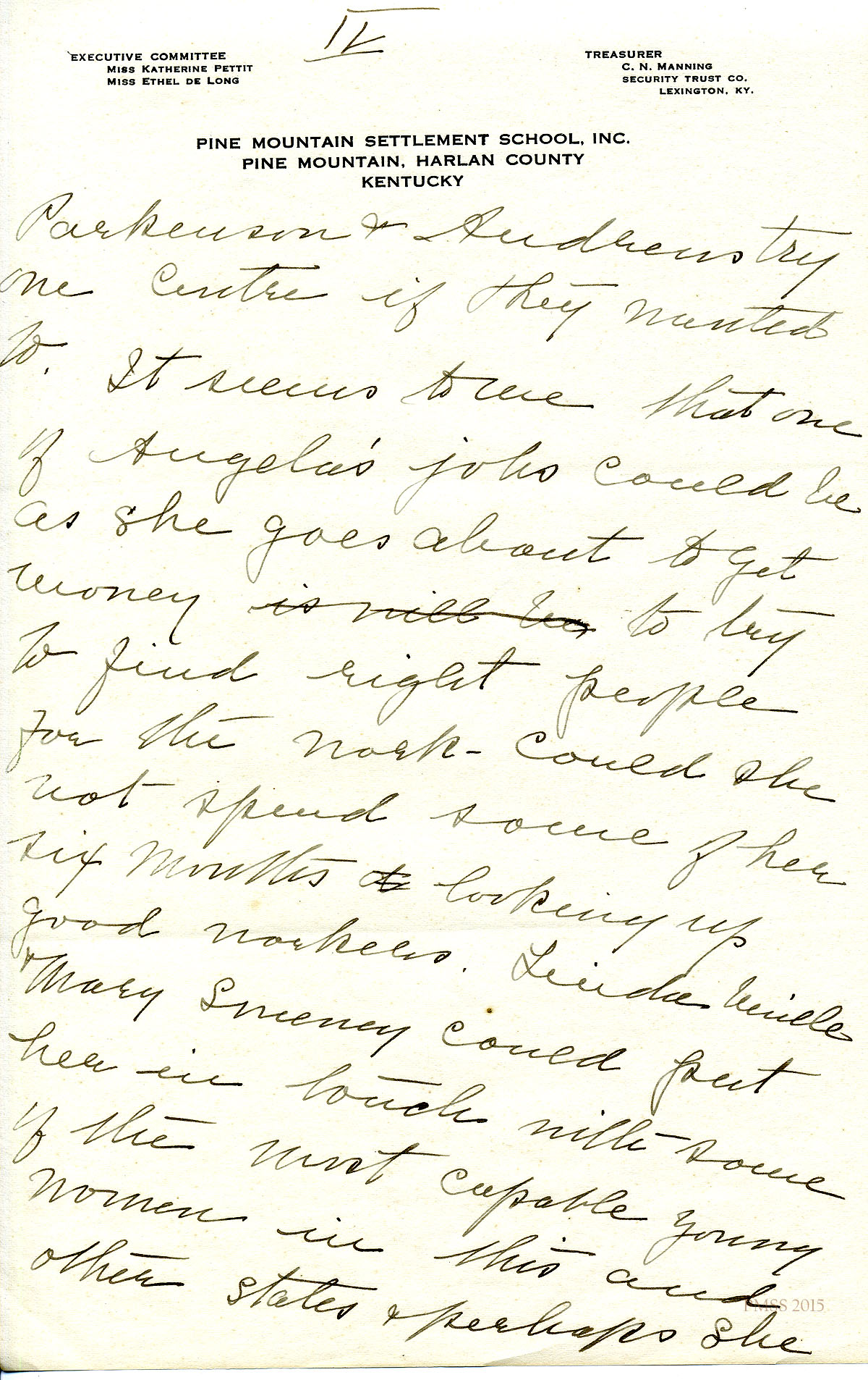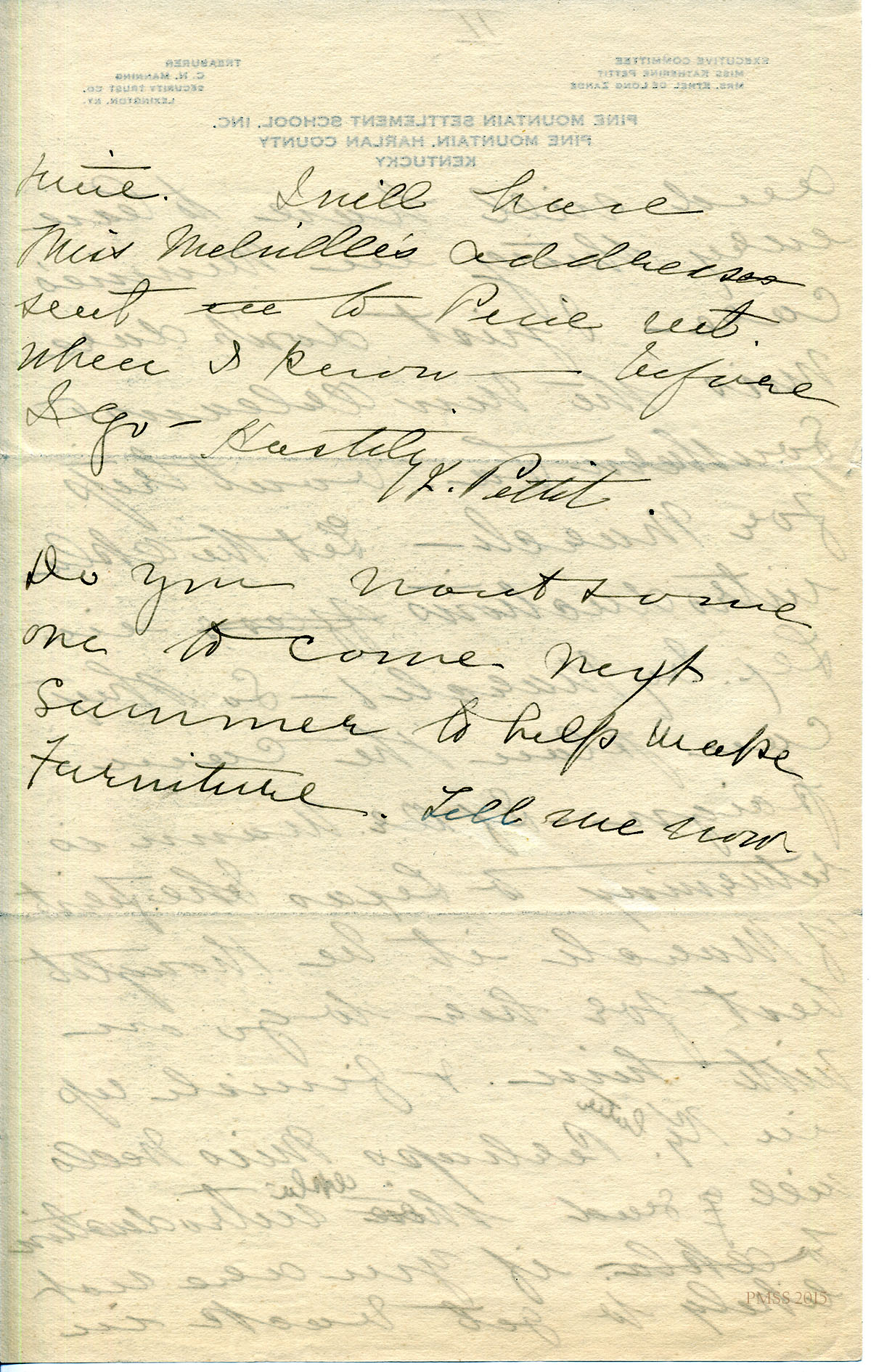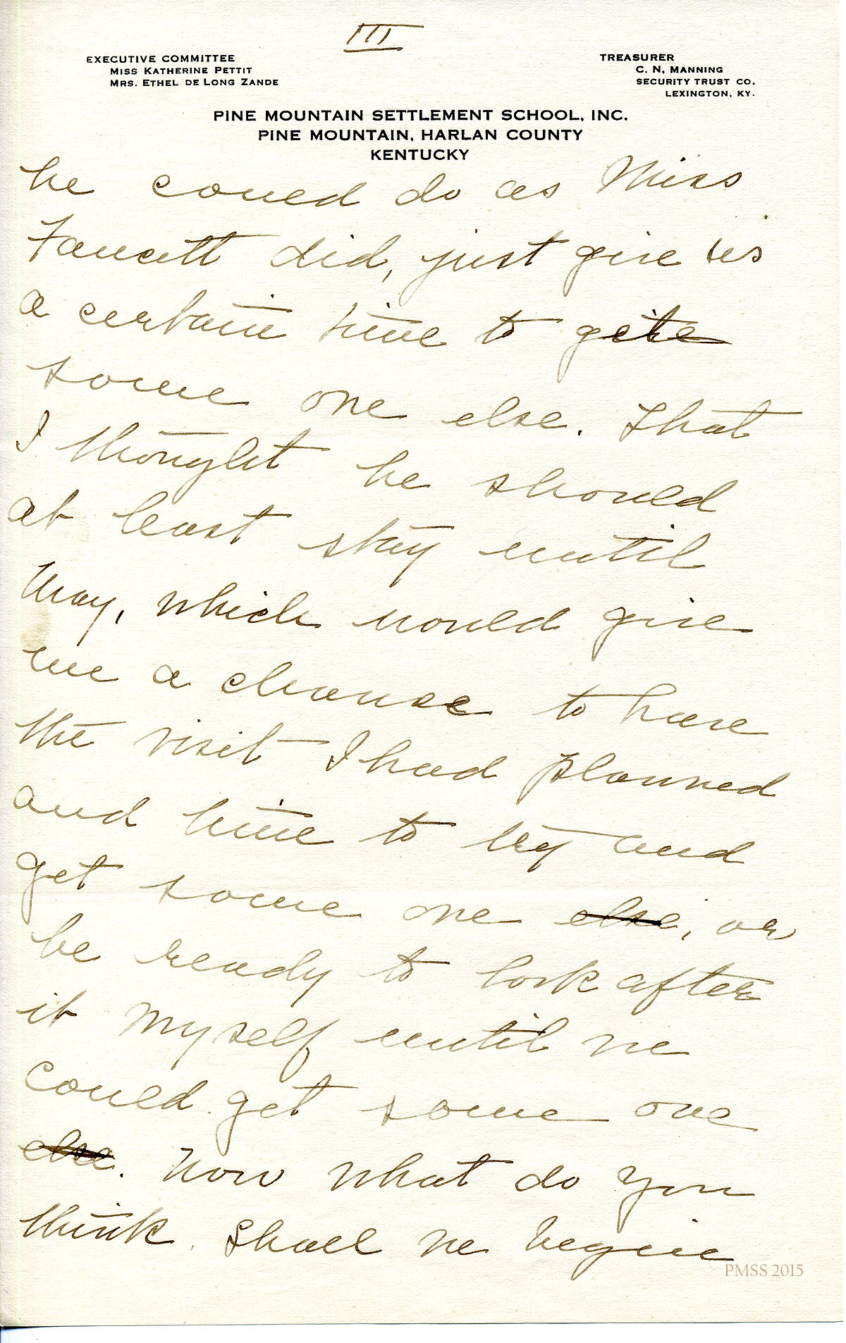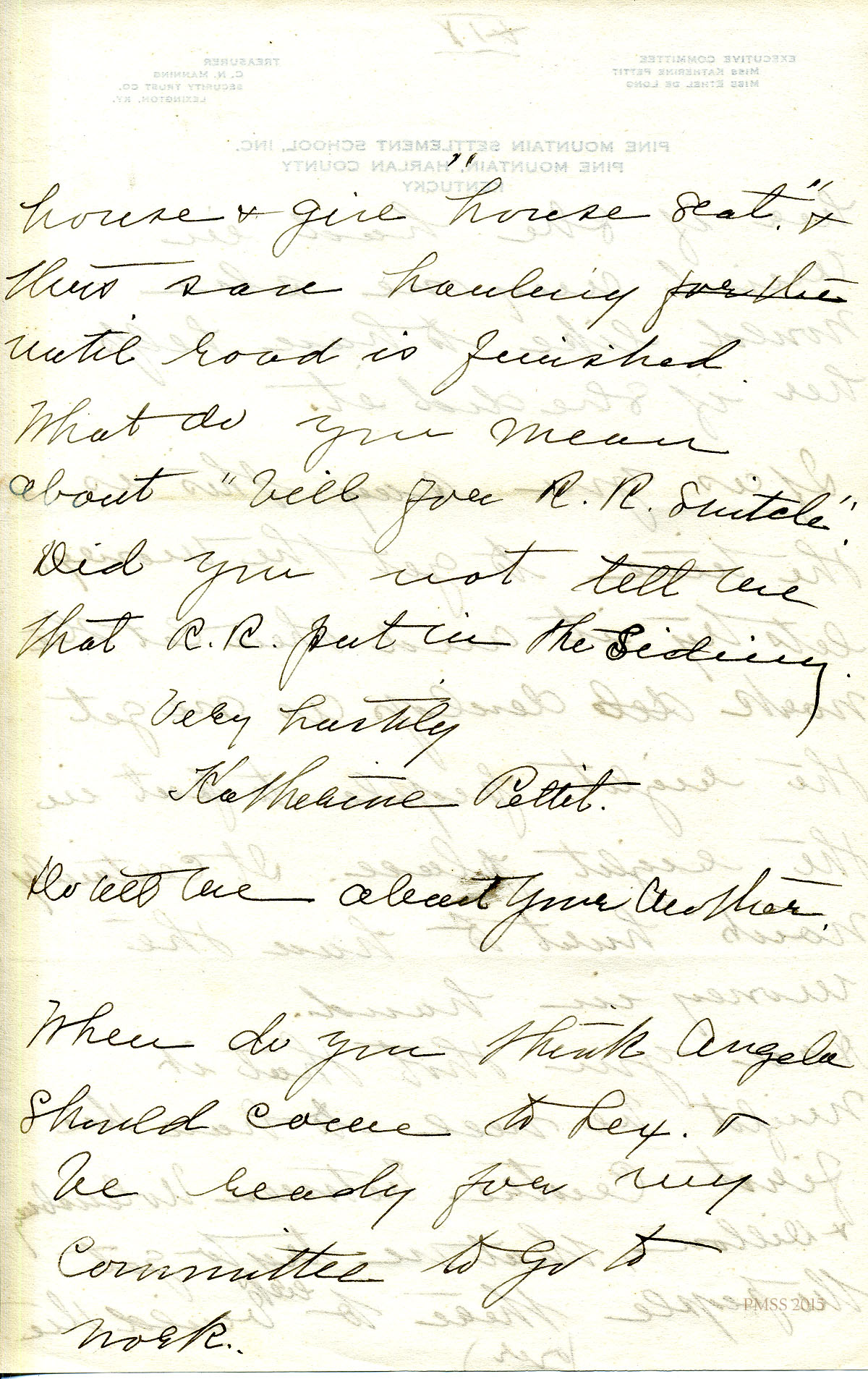 TAGS: Katherine Pettit, Ethel de Long Zande, Angela Melville, Fred Creech, Mr. Watkins, road-building, Henry Creech, Mr. Nolan, fundraising, extension work, Mr. and Mrs. Dorsay, Miss Sheltman, Miss Lawson, Rhoda Melinda, Minnie Bullock, Miss Robbins, Miss [Emily] Storer, Harriet Butler, convict labor, Annette Pettit, Line Fork, Walter Combs, furniture-makers, Mr. Leon Deschamps, surveys, mailing lists, Marguerite Butler, Josiah H. Cooke, Dr. Waller Bullock, Big Laurel, Peter Pan at May Day, Audrey Gratz, Nashville Agricultural Normal Institute, May Ritchie, Miss Parsons’ case, Celia Cathcart Holton
