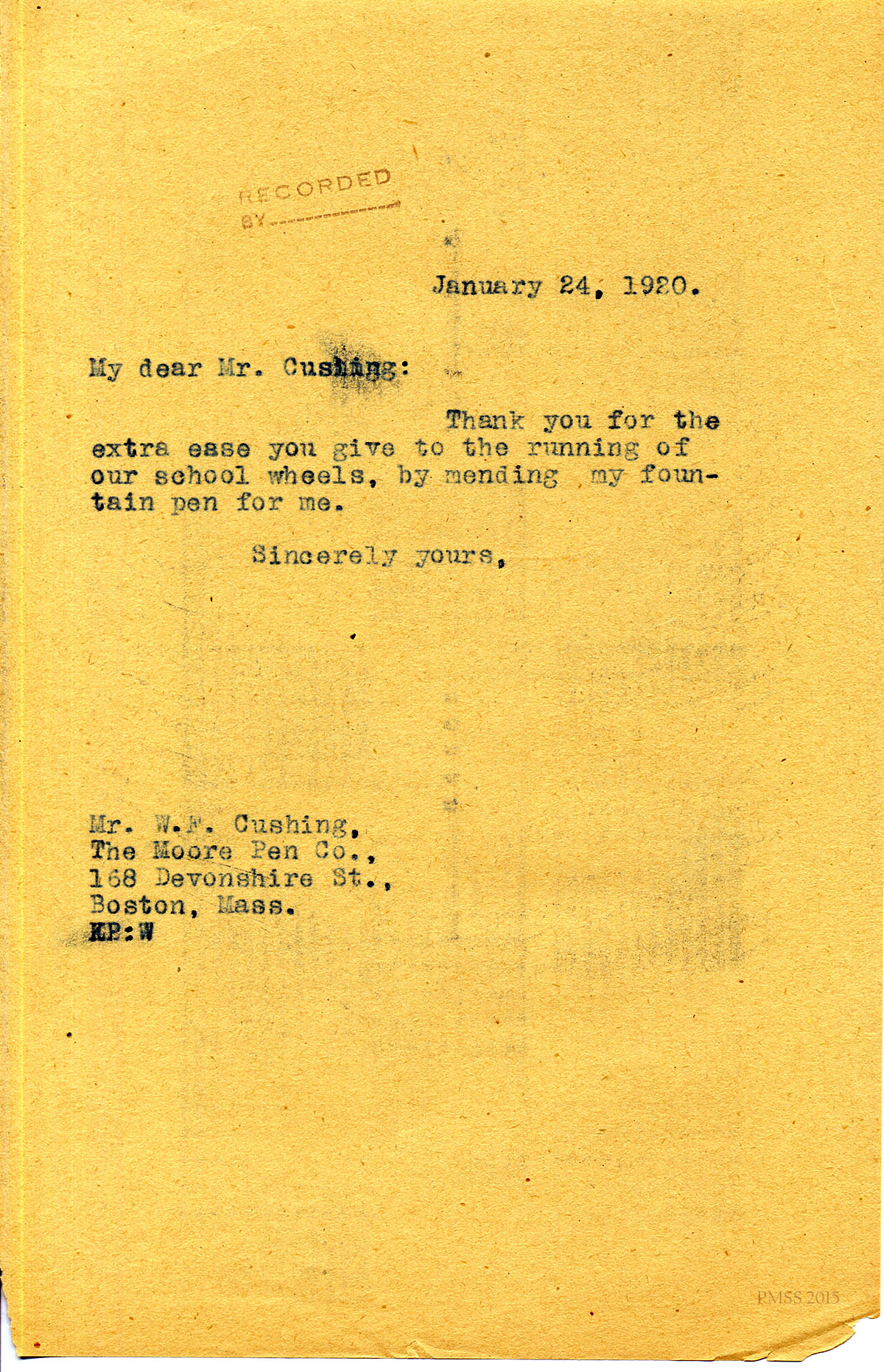 January 24, 1920. [unsigned] KP to Mr. W.F. Cushing, The Moore Pen Co.,