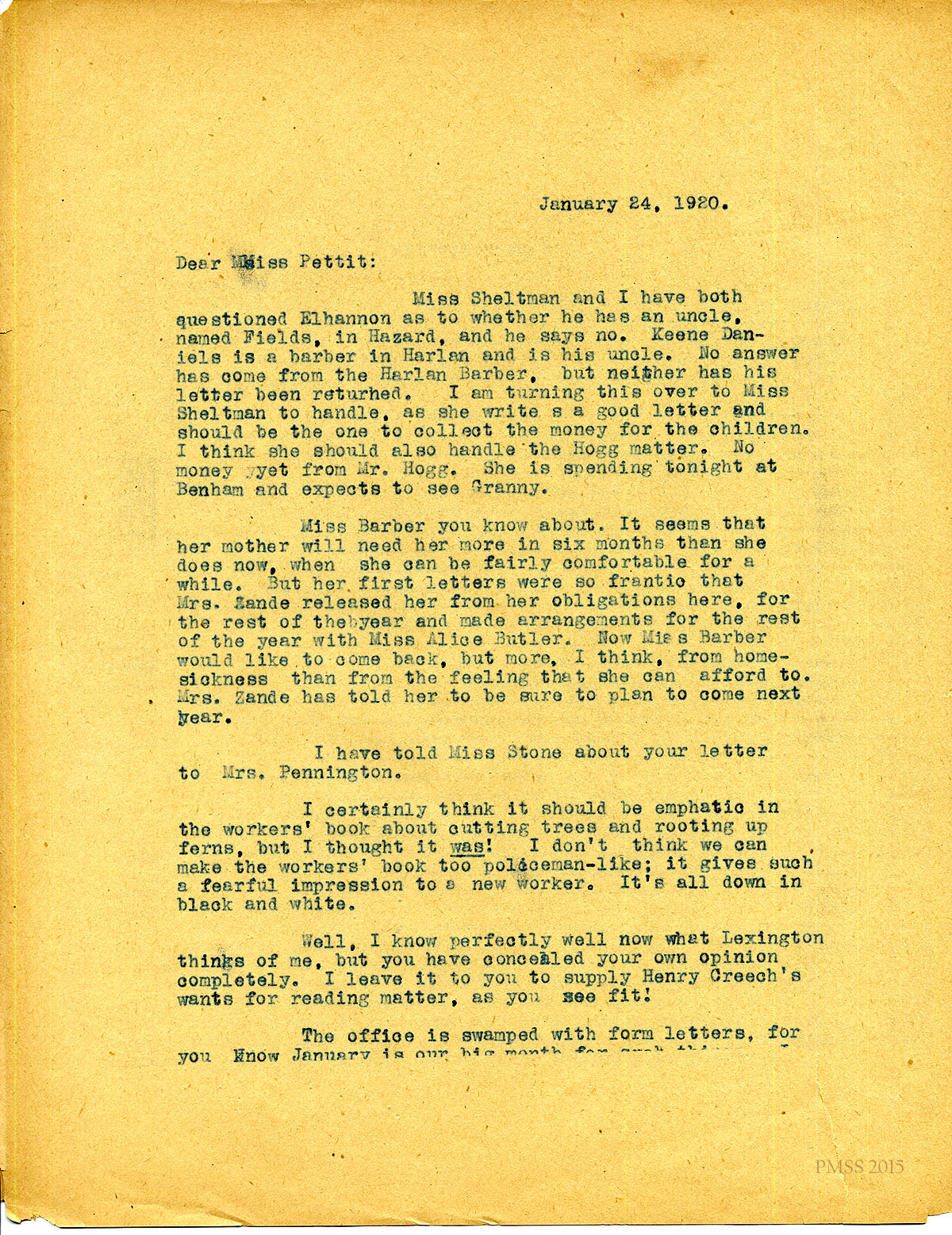 January 24, 1920. [unsigned] to Miss Pettit. Miss Sheltman; Elhannon; Miss
