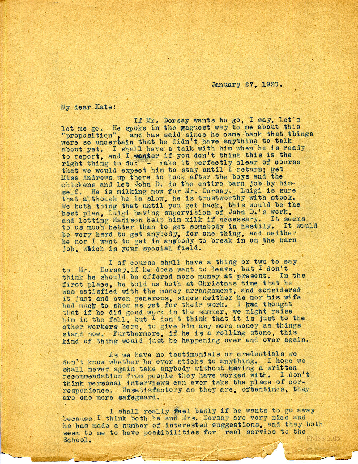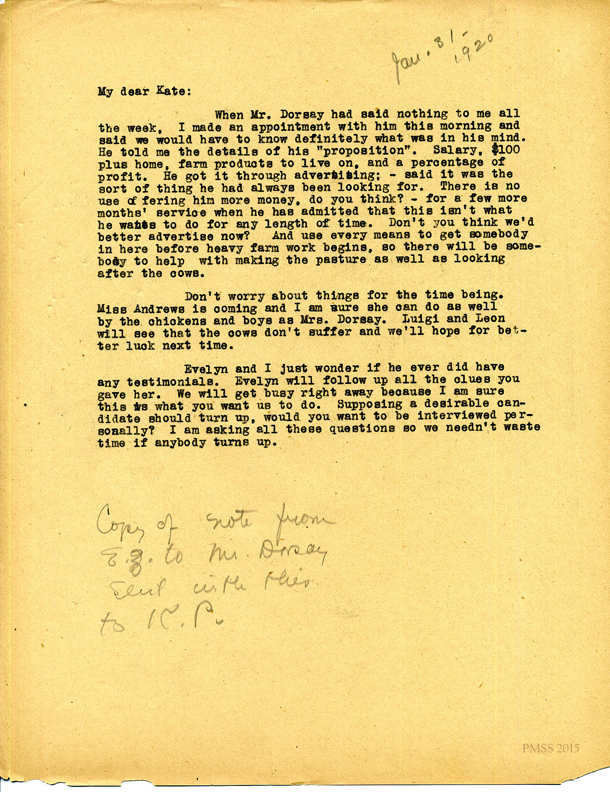 January 31, 1920. [unsigned] to “Kate” Pettit. Replacing Mr. Dorsay. [037]