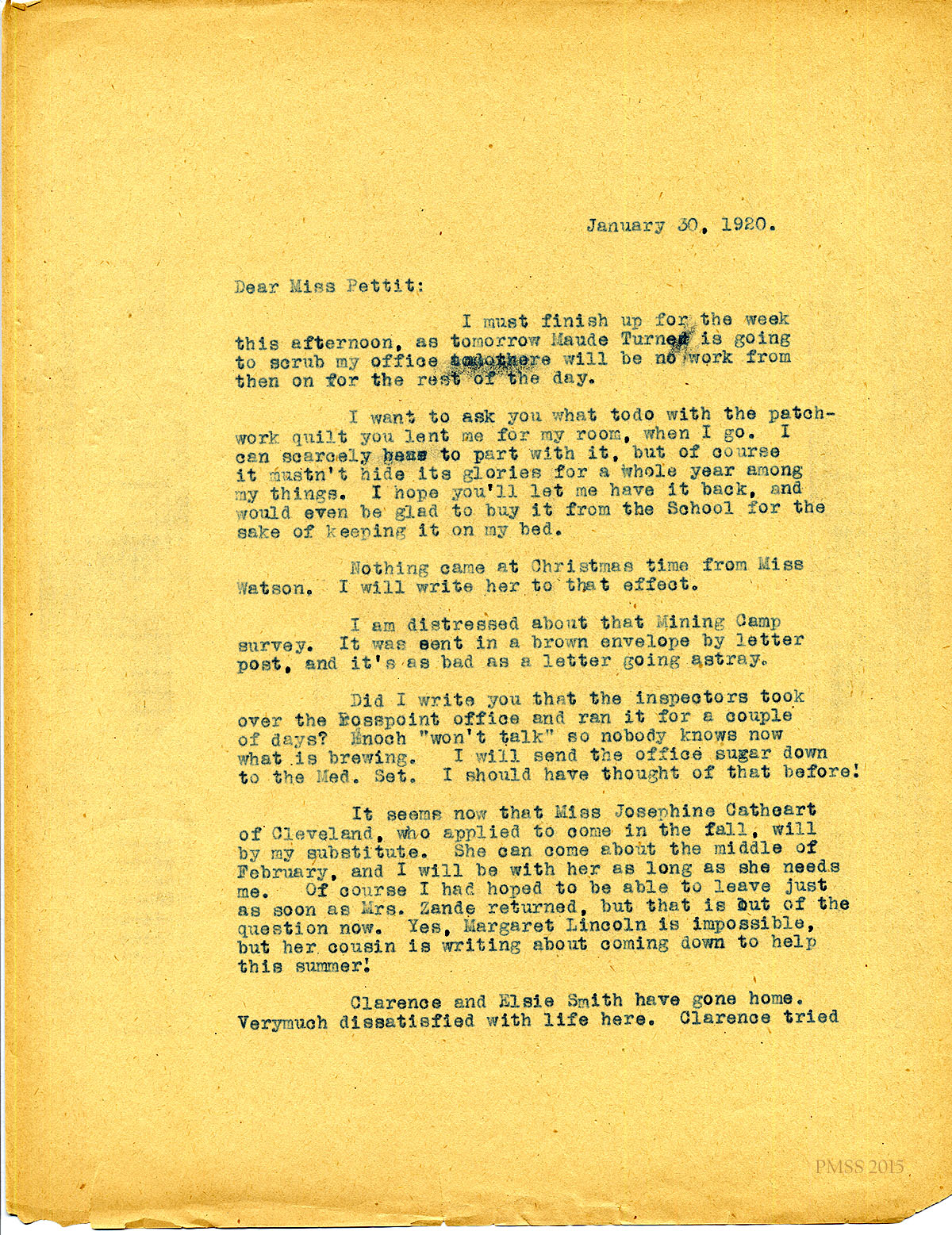 January 30, 1920. [missing second page] to Miss Pettit. Mining Camp survey; mail inspectors; Josephine Cathcart arriving in fall; Clarence & Elsie Smith left. … [036]