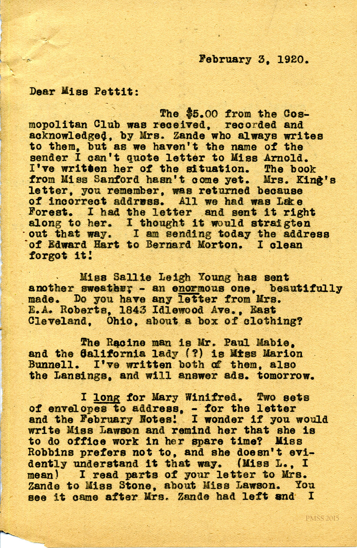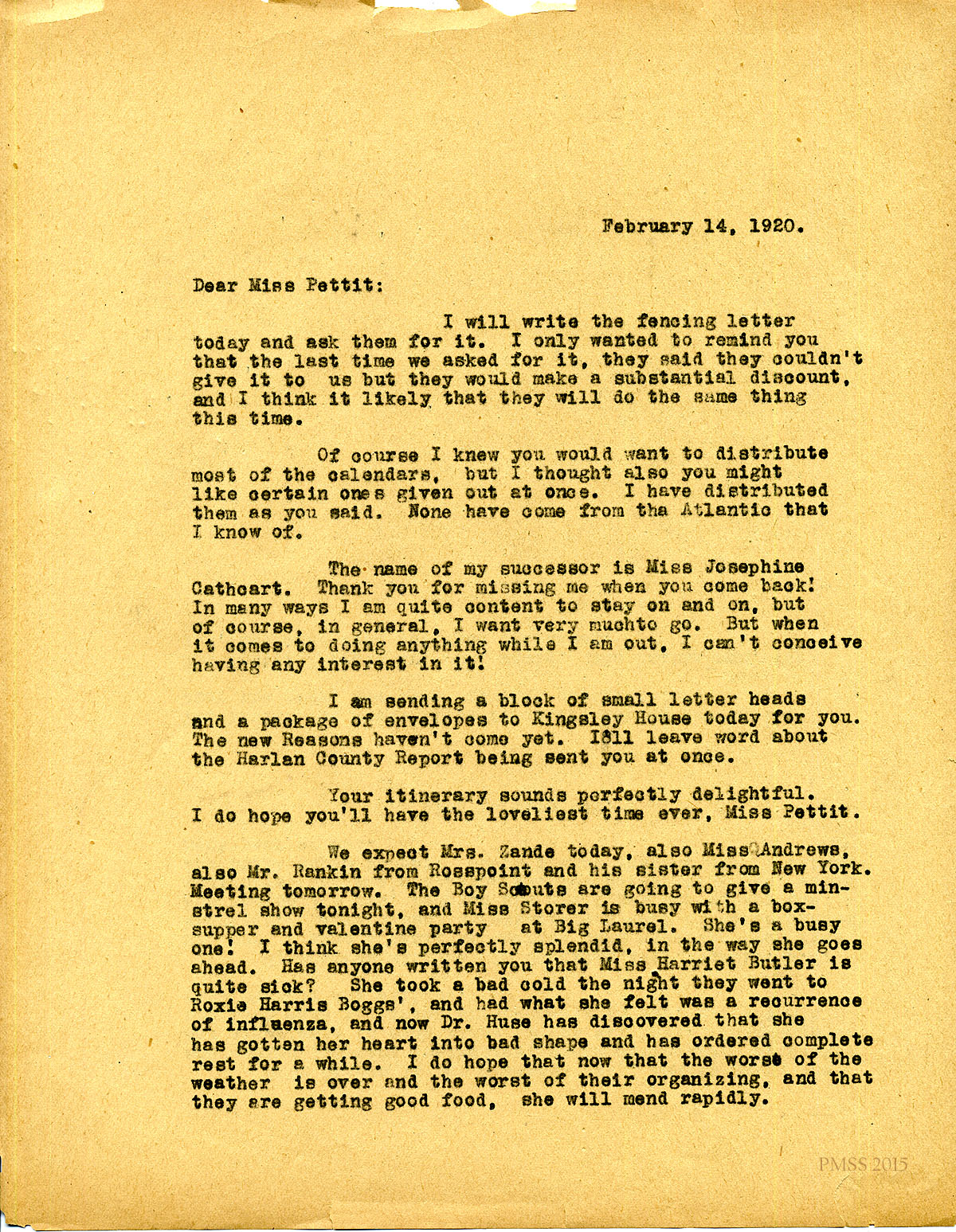 February 14, 1920. [unsigned] to Miss Pettit. Fencing; calendars; Mrs. Zande returns today; Boy Scouts; Miss Storer; Harriet Butler; Miss Lawson. [050-051]
