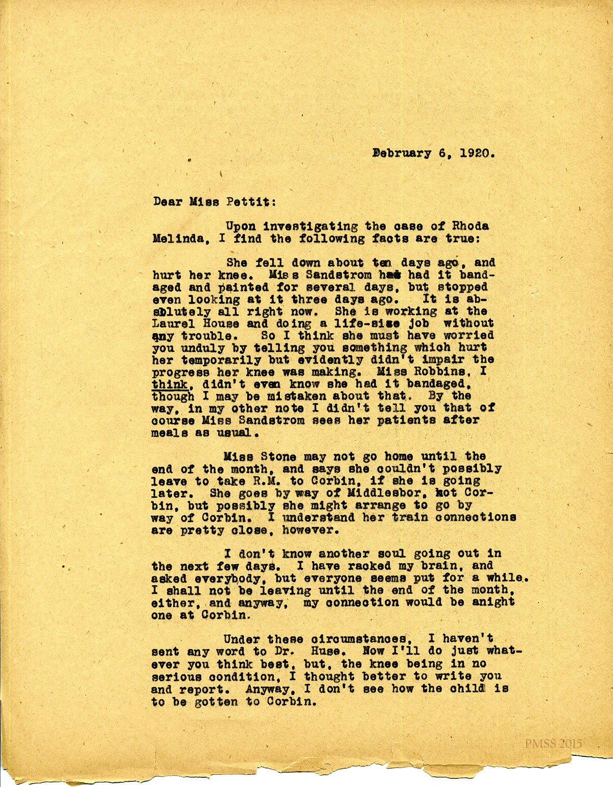 February 6, 1920. [unsigned] to Miss Pettit. Details of Rhoda Melinda’s knee injury. [041-042]