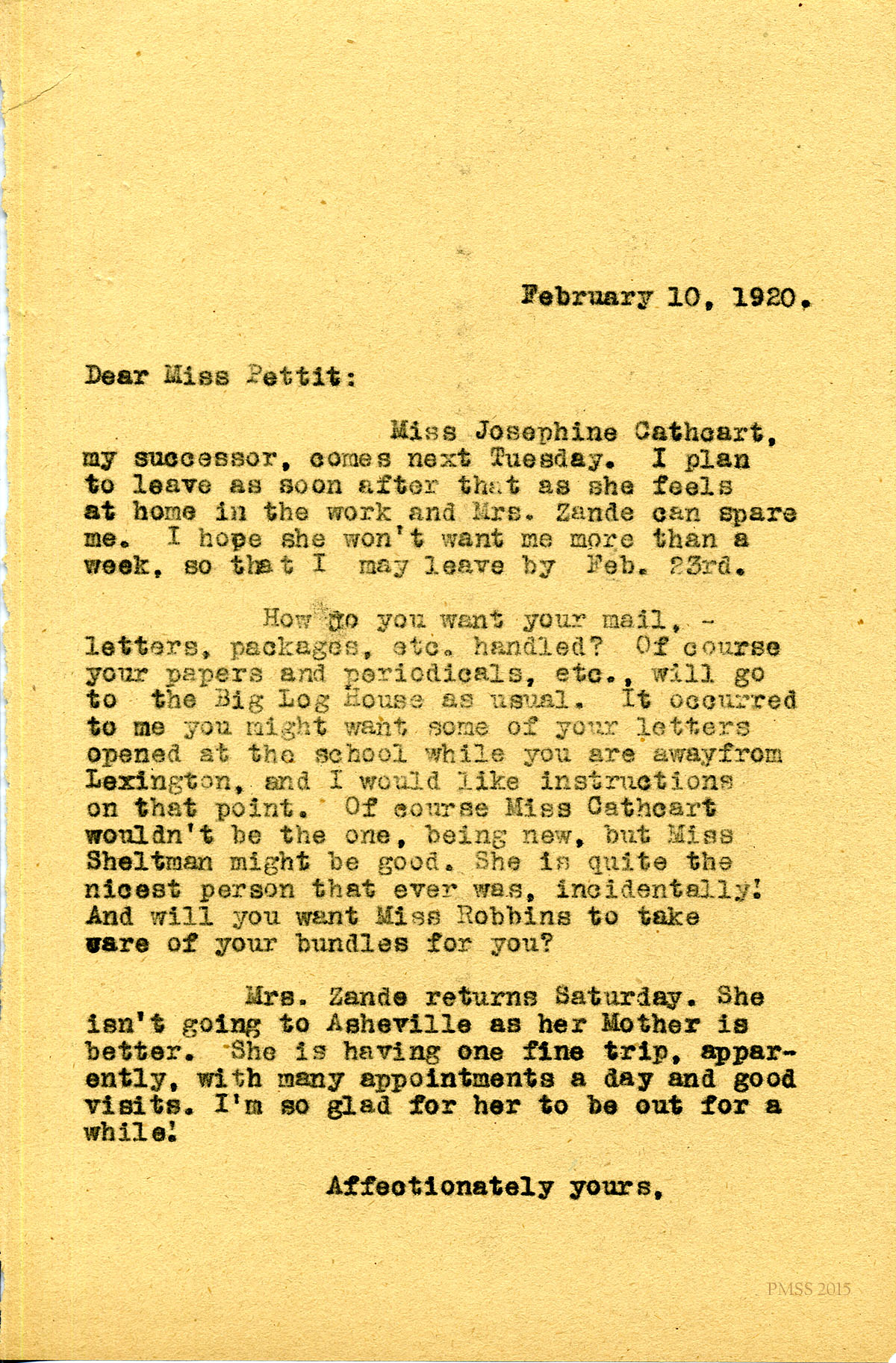February 10, 1920. [unsigned] to Miss Pettit. Josephine Cathcart to arrive as replacement; Miss Sheltman & Miss Robbins can help with your mail. [049]