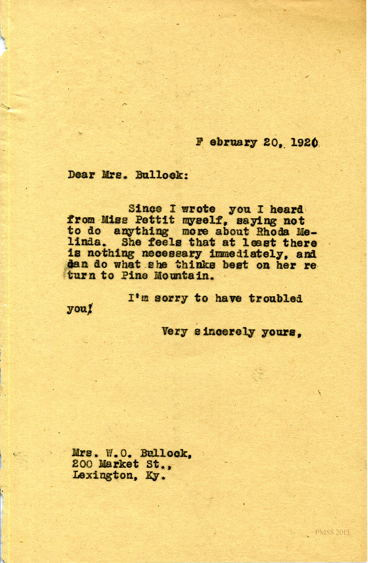 February 20, 1920. [unsigned] to Mrs. W. O. Bullock, Lexington, KY. Miss Pettit wrote that Rhoda Melinda should stay at P.M. [053]