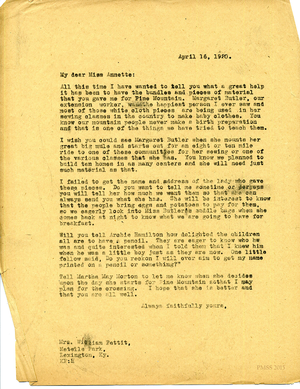 April 16, 1920. [unsigned] KP to “Miss Annette” (Mrs. William Pettit). Thanks for bundles and material; Margaret Butler; sewing classes; Martha May Norton. [056]