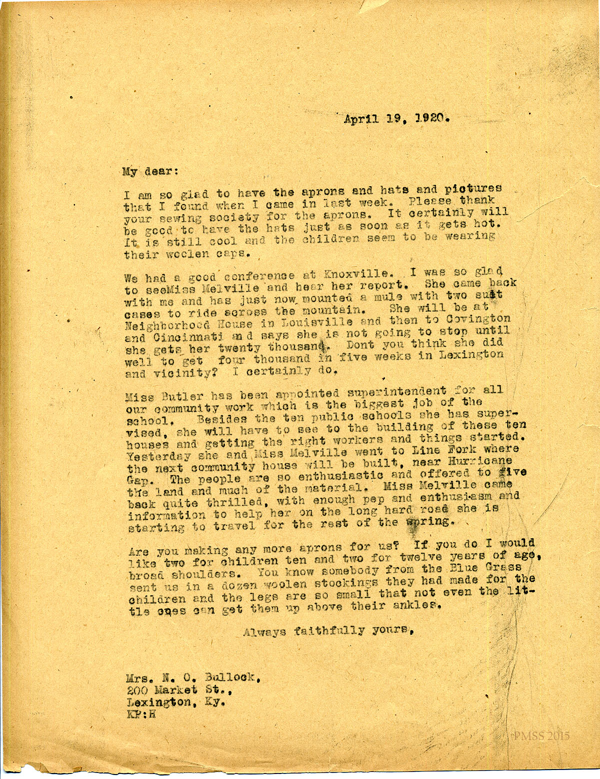 April 19, 1920. [unsigned] KP to Mrs. W.O. Bullock, Lexington, KY. Thanks for hats; sewing society for aprons; Miss Melville; Miss Butler; Line Fork. [057]