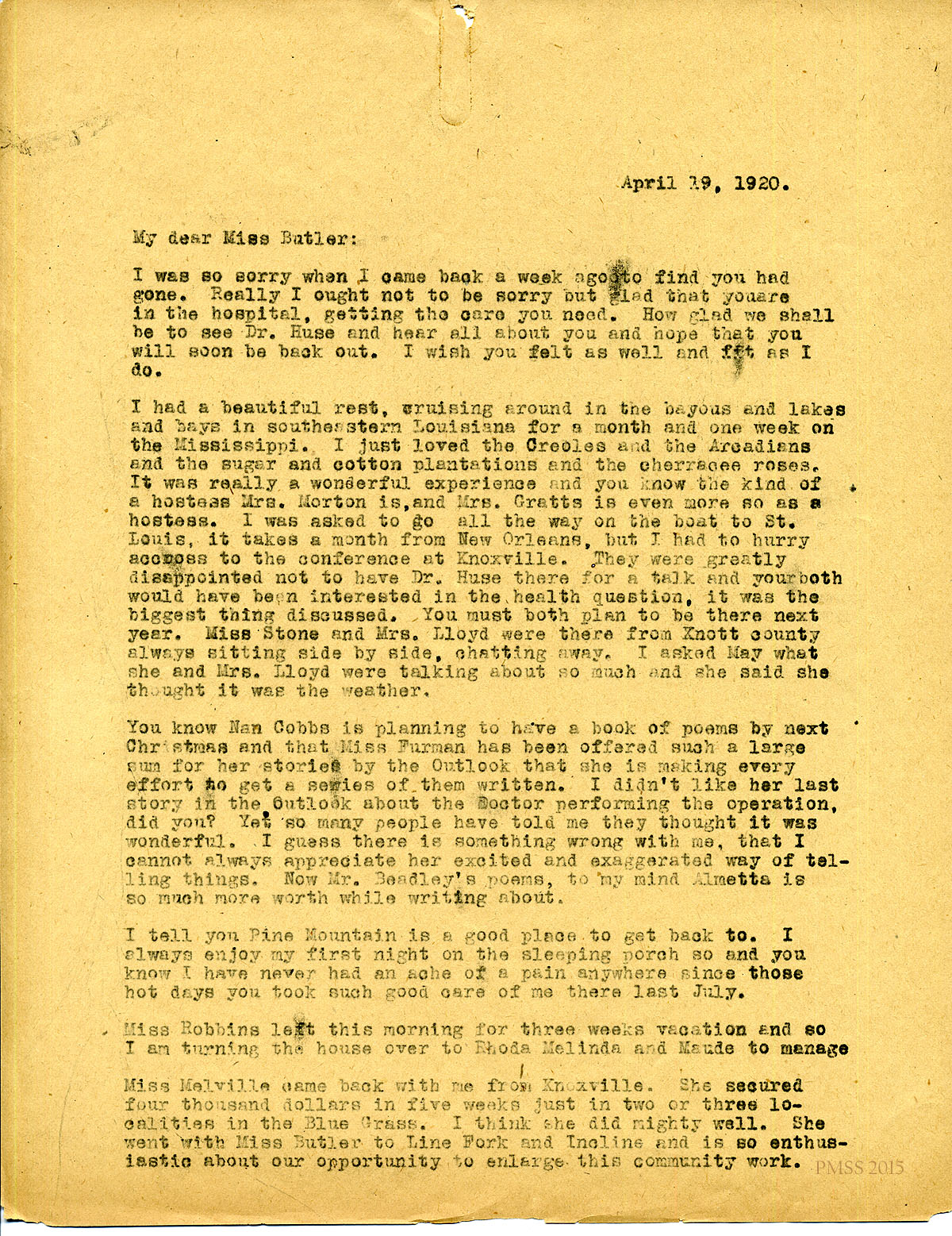April 19, 1920. [unsigned] KP to Miss Harriet Butler, St. Louis, MO. Sorry you are in hospital; Louisiana cruise; Nan Cobbs’ book; Miss Furman’ stories. [058-059]