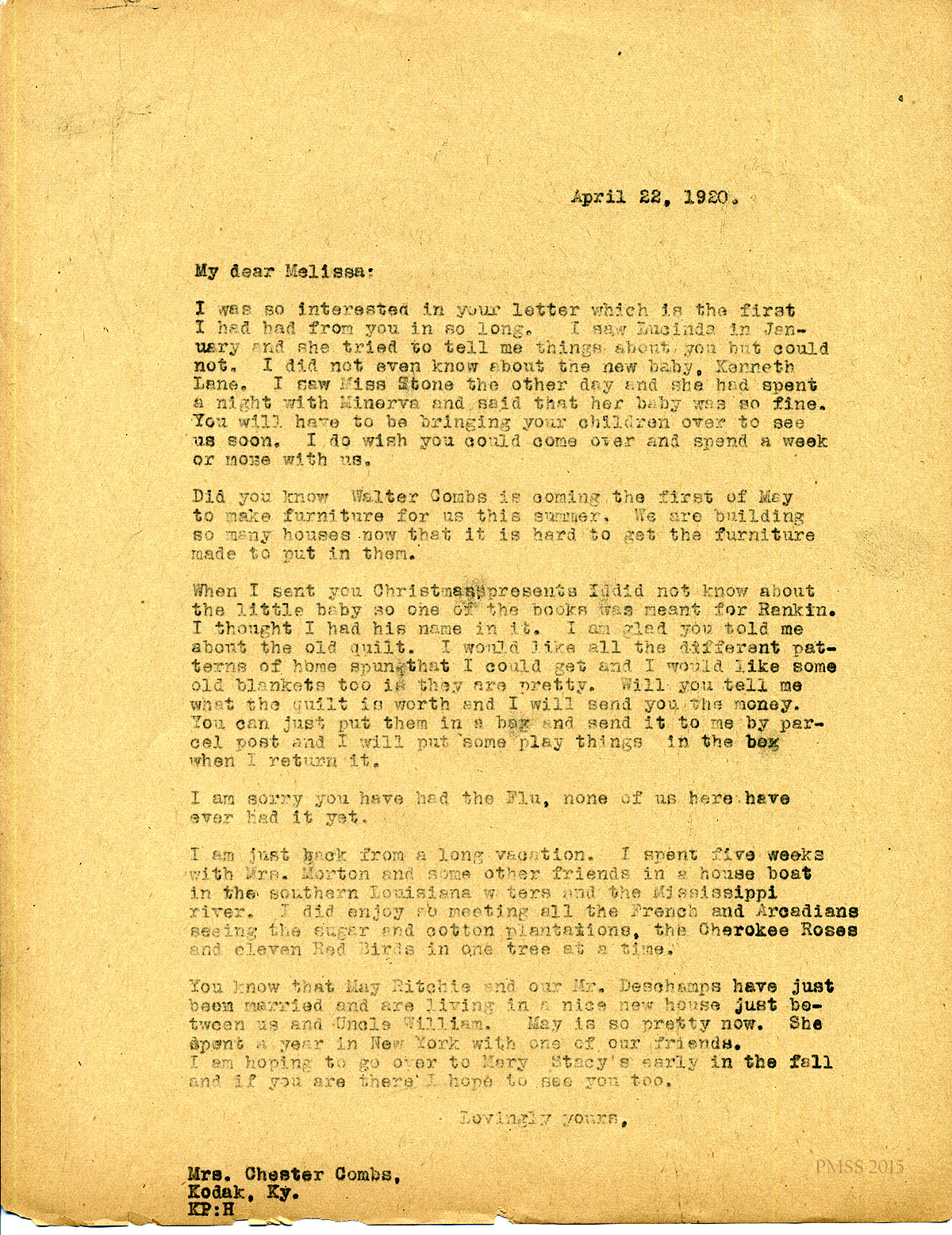 April 22, 1920. [unsigned] KP to “Melissa” (Mrs. Chester Comb), Kodak,