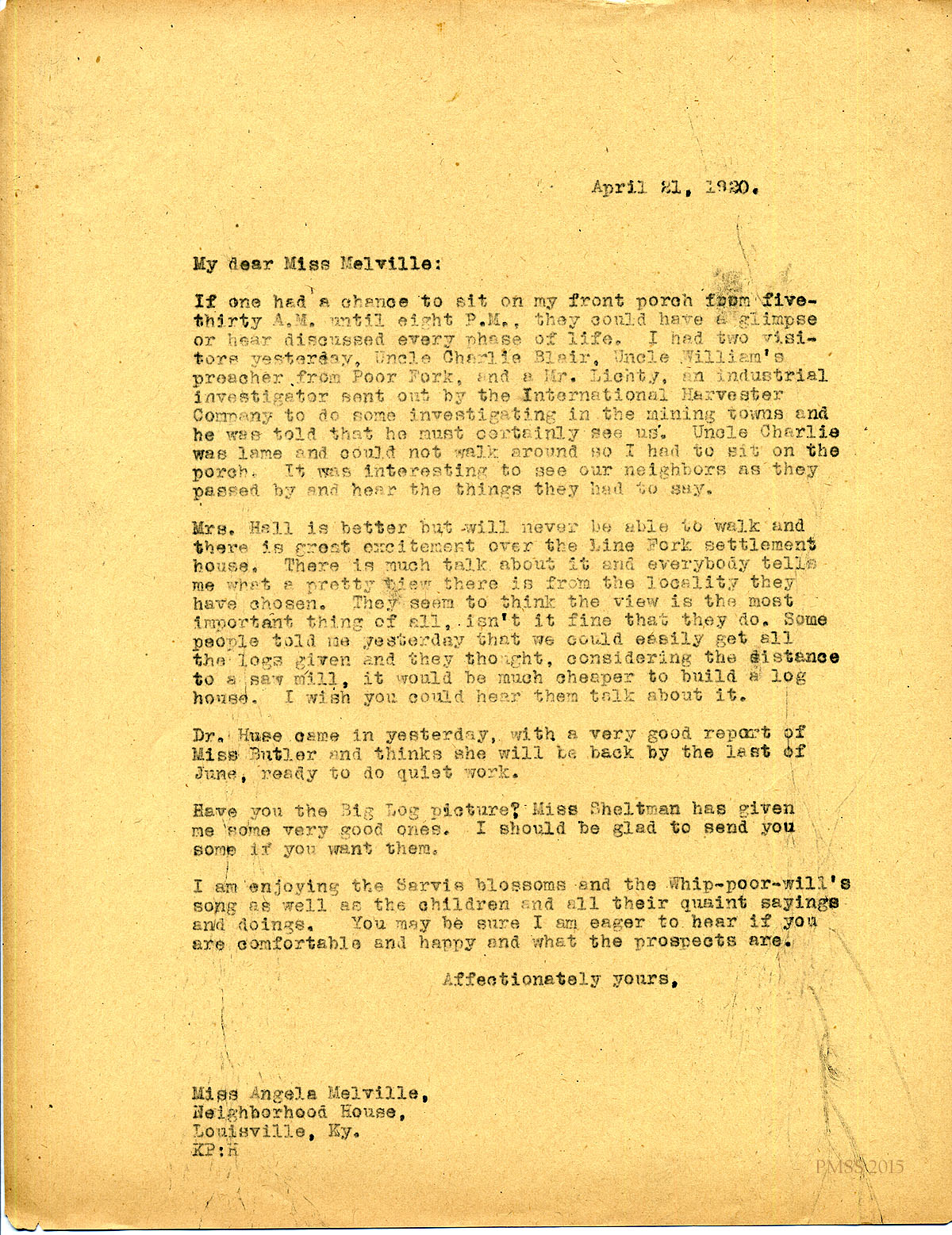 April 21, 1920. [unsigned] KP to Miss (Angela) Melville, Louisville, KY. Uncle Charlie Blair; Line Fork settlement house. [061]