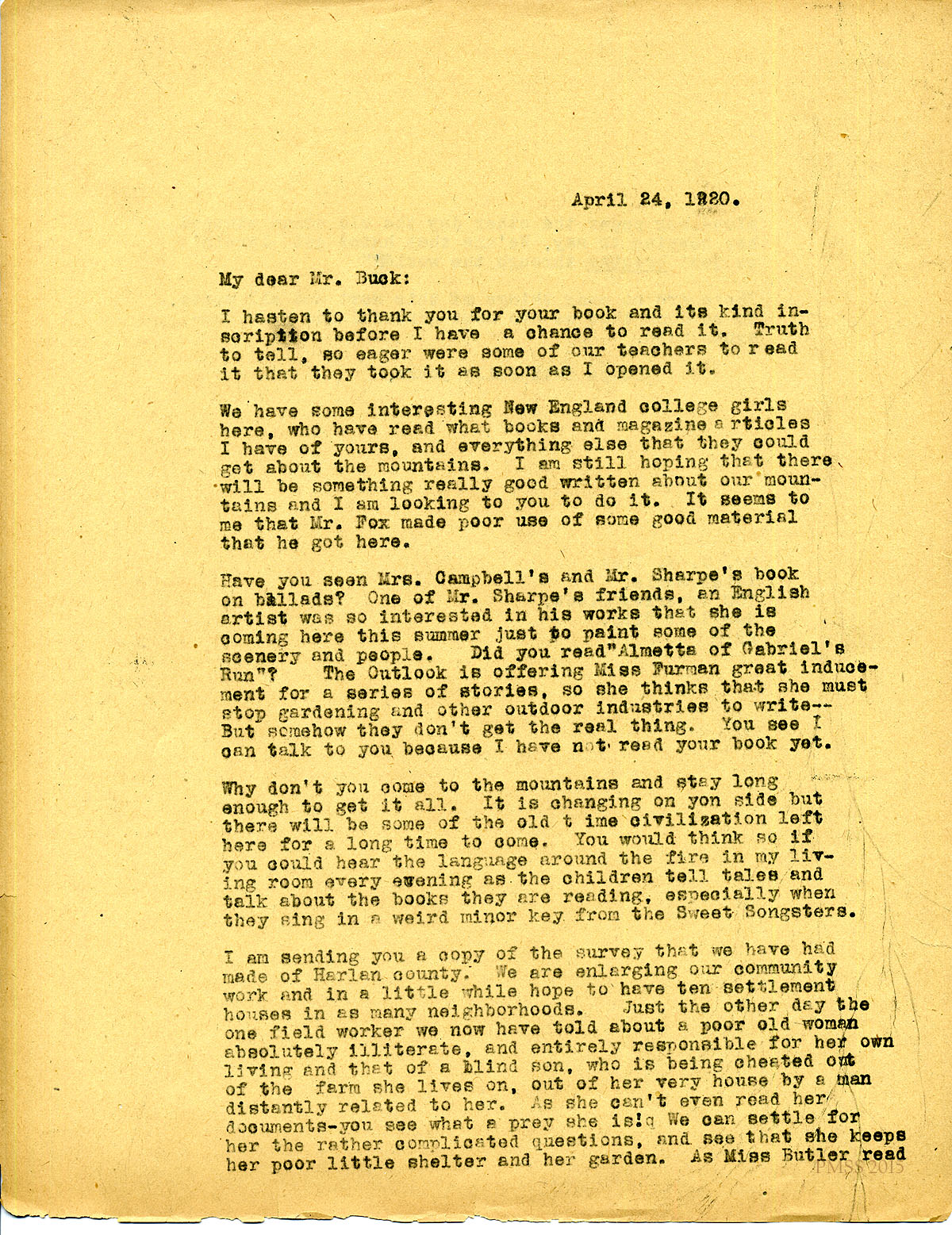 April 24, 1920. [unsigned] KP to Mr. C.N. Buck, New York, NY. Mrs. Campbell and Mr. Sharp’s ballad book; survey of Harlan county; extension plans. [062-063]