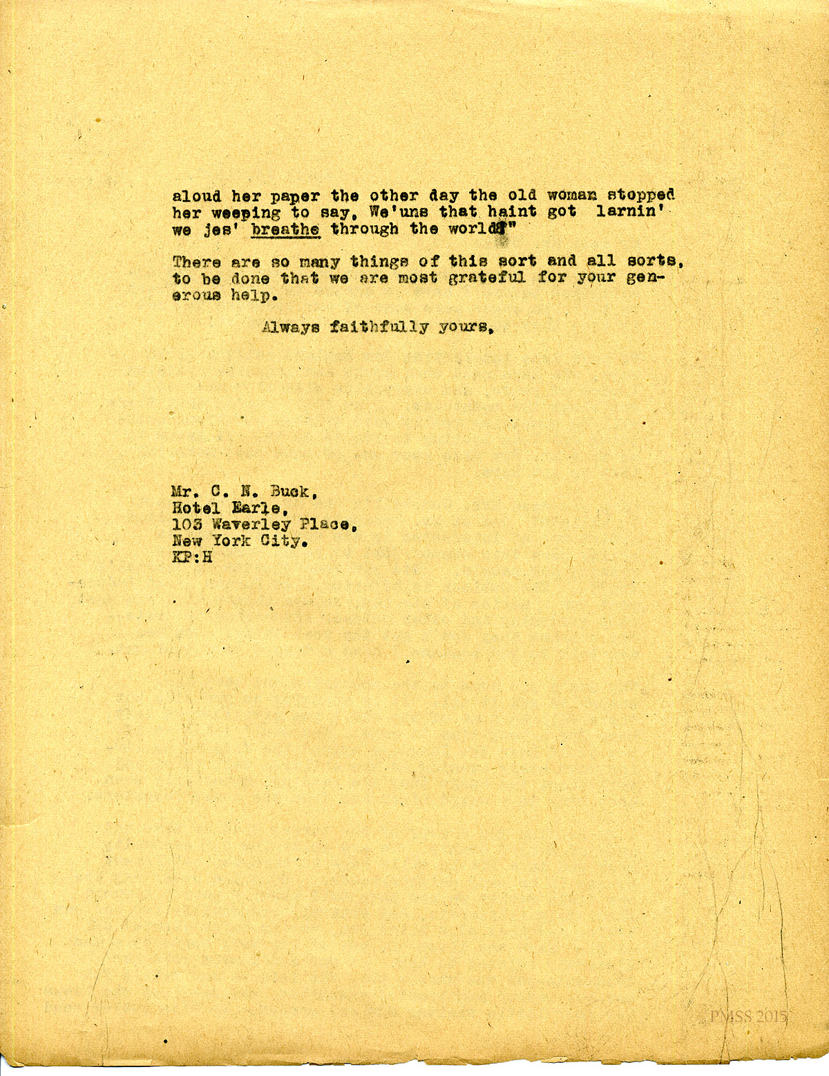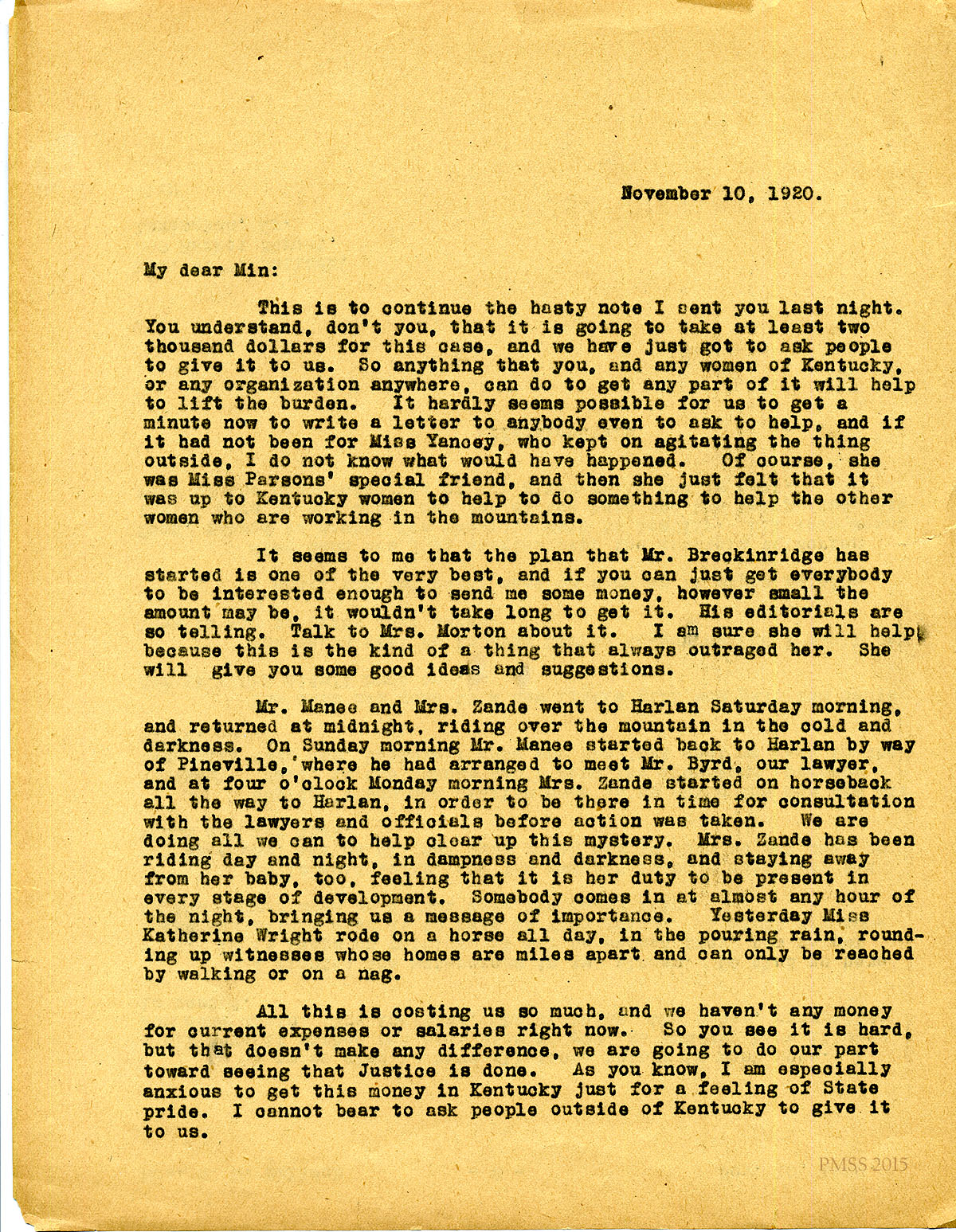 November 10, 1920. [unsigned] KP to “Min” (Mrs. W.O. Bullock), Lexington, KY. Need money for Parsons case; Mr. Breckinridge’s editorials; Mrs. Zande’s work. [109-110]