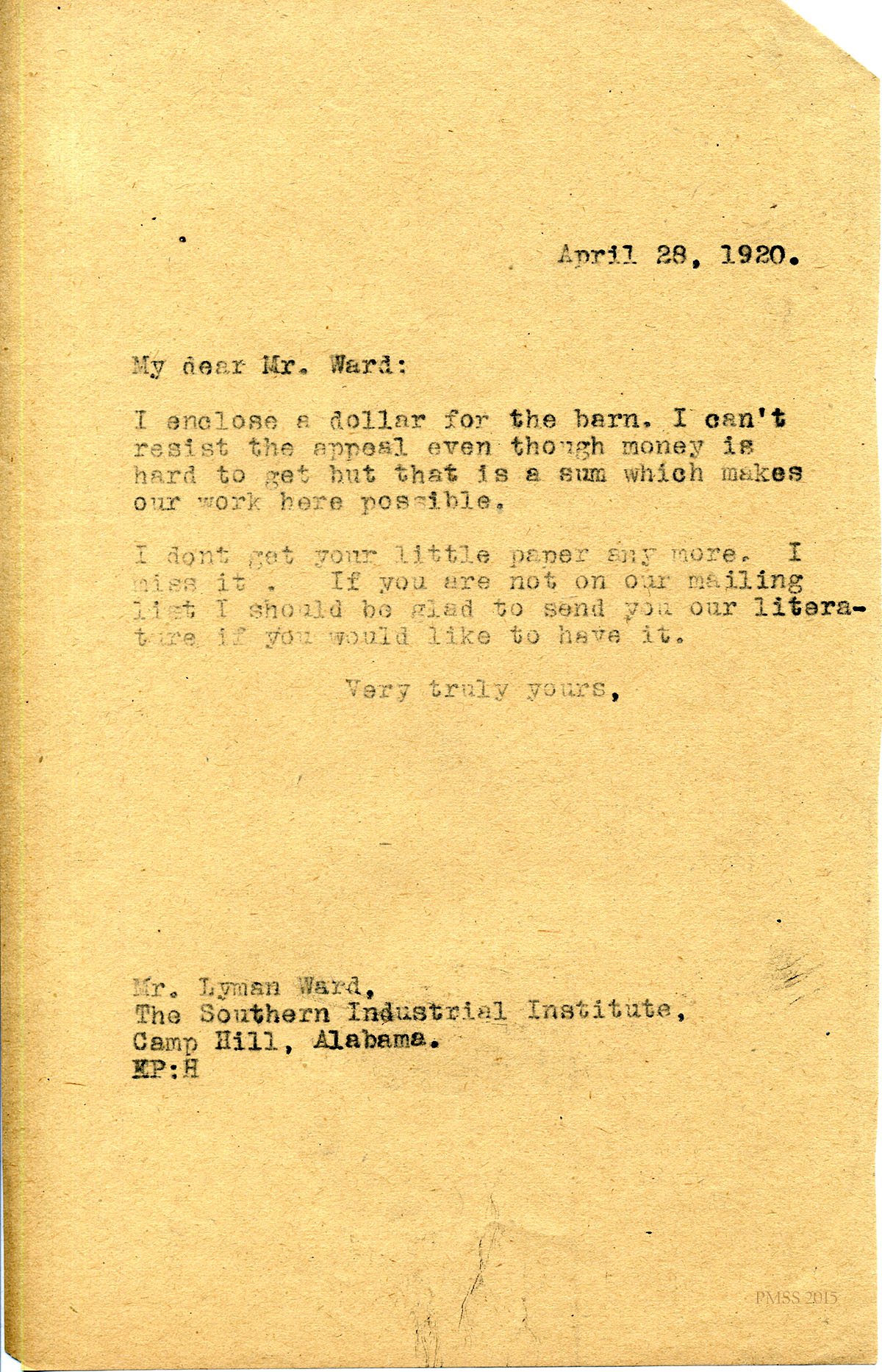 April 28, 1920. [unsigned] KP to Mr. Lyman Ward, The Southern Industrial