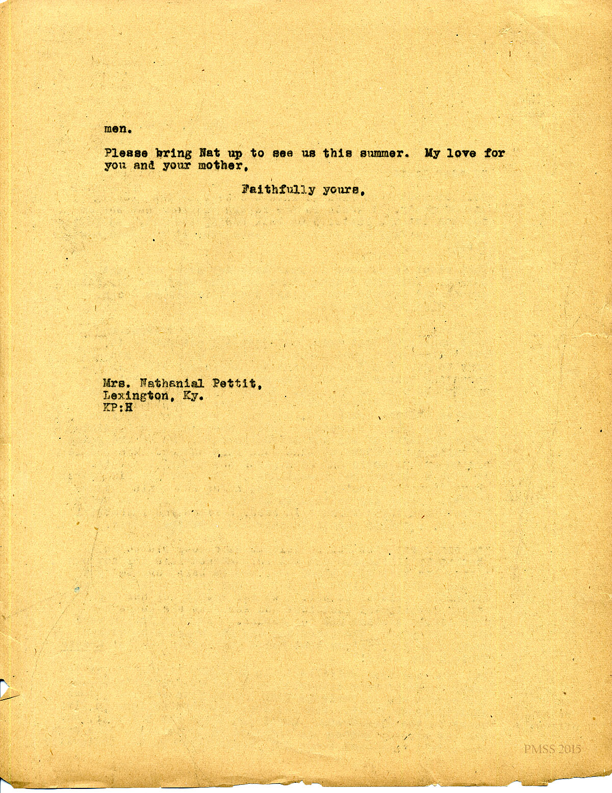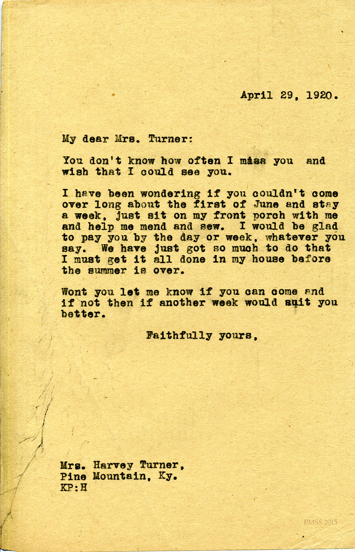 April 29, 1920. [unsigned] KP to Mrs. Harvey Turner: invites her to visit. [065]