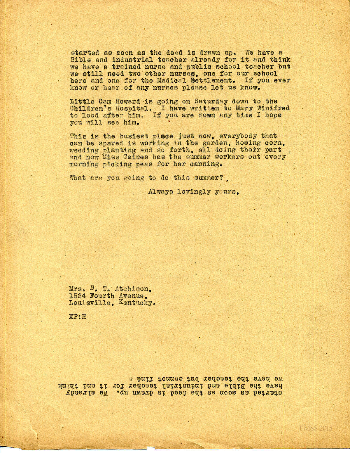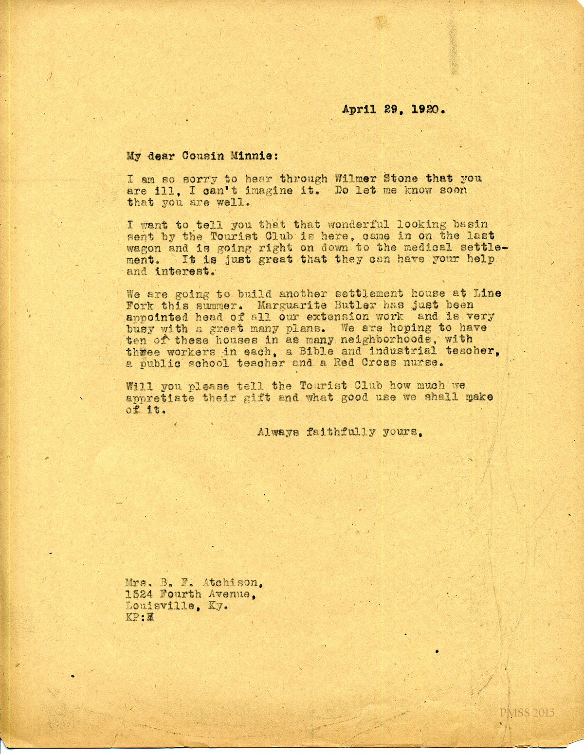 April 29, 1920. [unsigned] KP to “Cousin Minnie” (Mrs. B.F. Atchison), Louisville KY. Plans for new extension settlement houses; thanks for Tourist Club gift. [066]