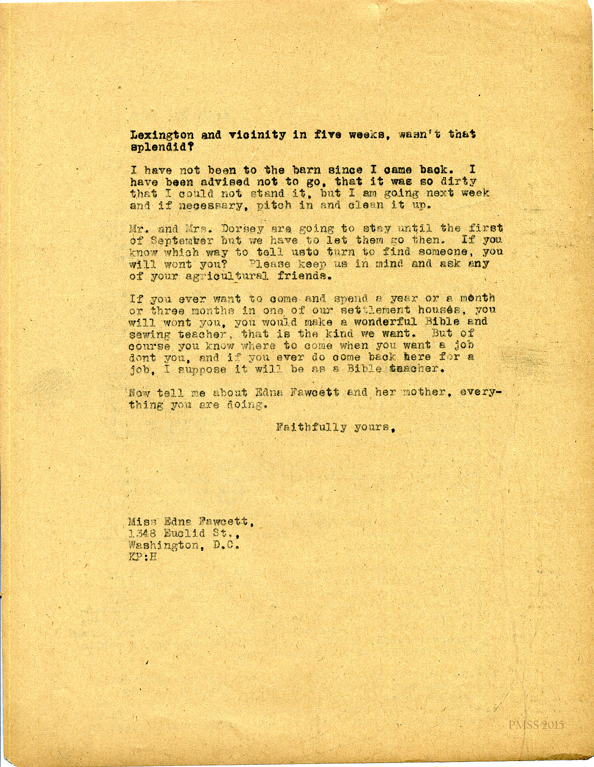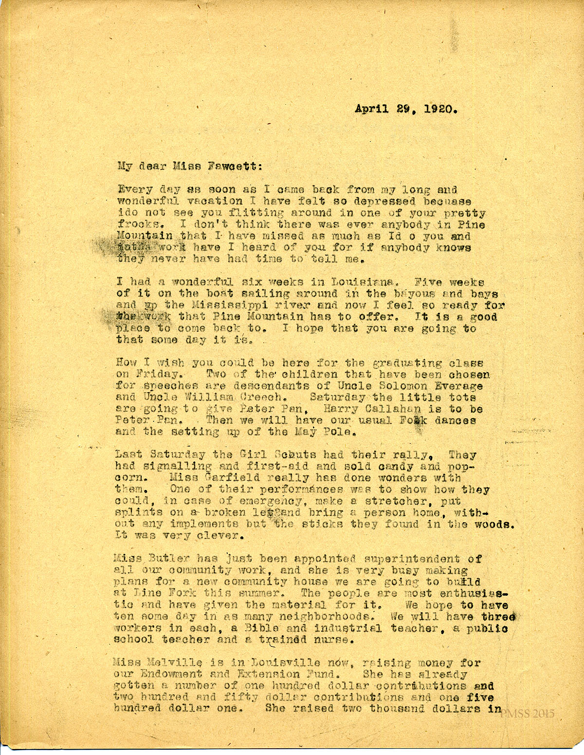 April 29, 1920. [unsigned] KP to Miss Edna Fawcett. Louisiana visit; graduation events; Girl Scout rally; Miss Butler’s work; extension plans; Miss Melville’s fundraising; barn; Mr. and Mrs. Dorsay; invites her to teach at P.M. [067-068]