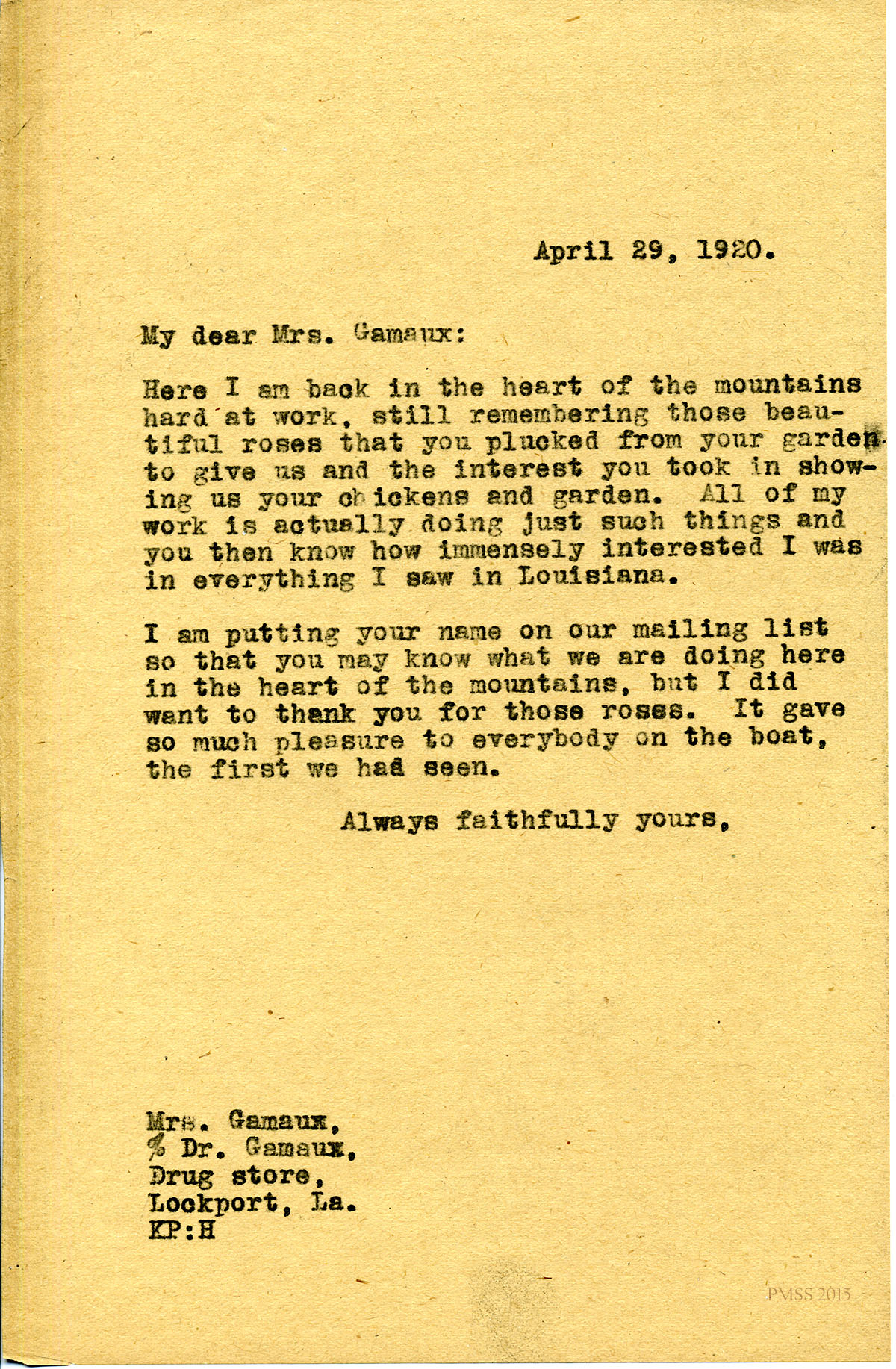 April 29, 1920. [unsigned] KP to Miss Gamaux, Lockport, LA. Added to mailing list. [069]