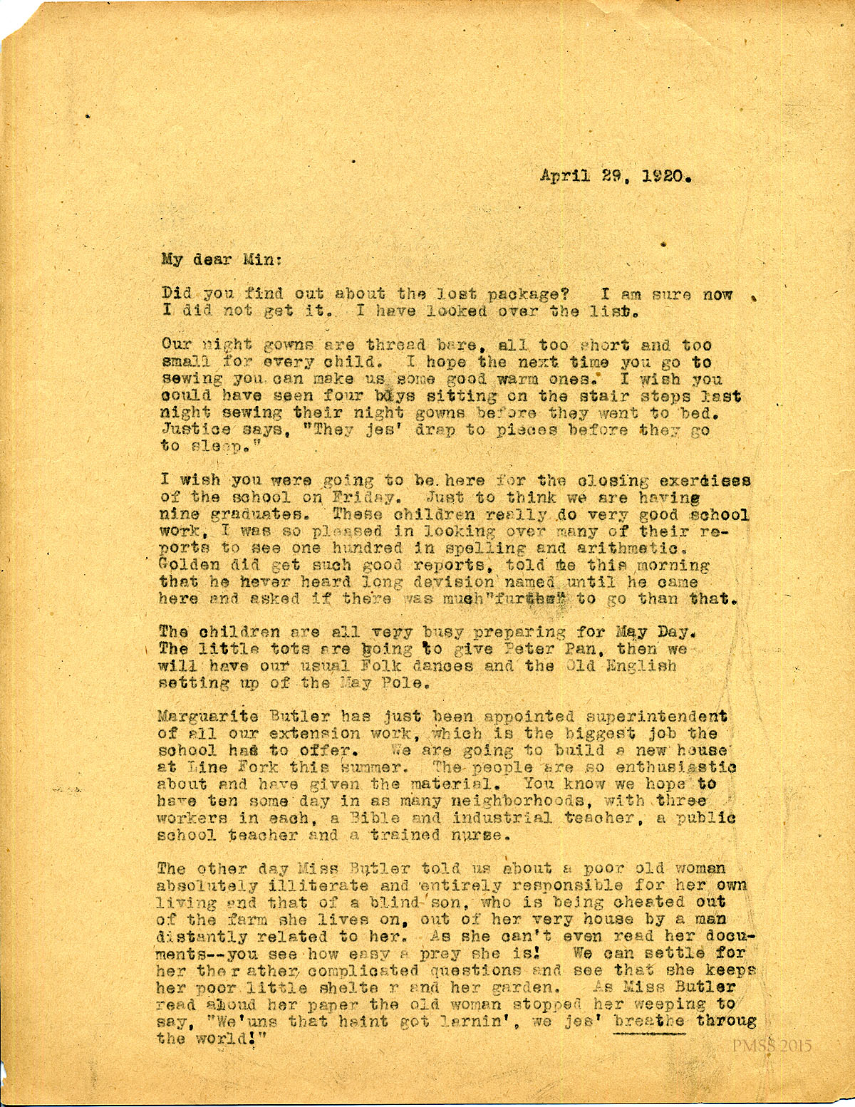 April 29, 1920. [unsigned] KP to “Min” (Mrs. W.O. Bullock), Lexington, KY. Need for nightgowns; graduation & May Day events; Marguerite Butler’s work; extension plans; Miss Melville’s fundraising. [070-071]