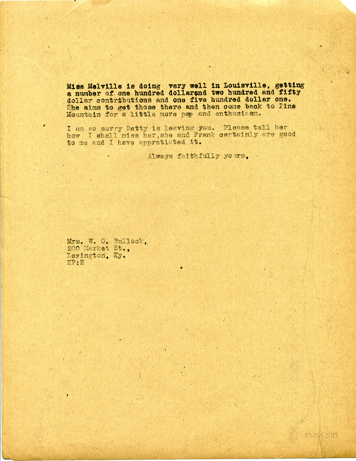 December 3, 1920. [unsigned] KP to “Min” (Mrs. W.O. Bullock), Lexington, KY. Thanks for raising money for Herald Fund; pianola. [113]