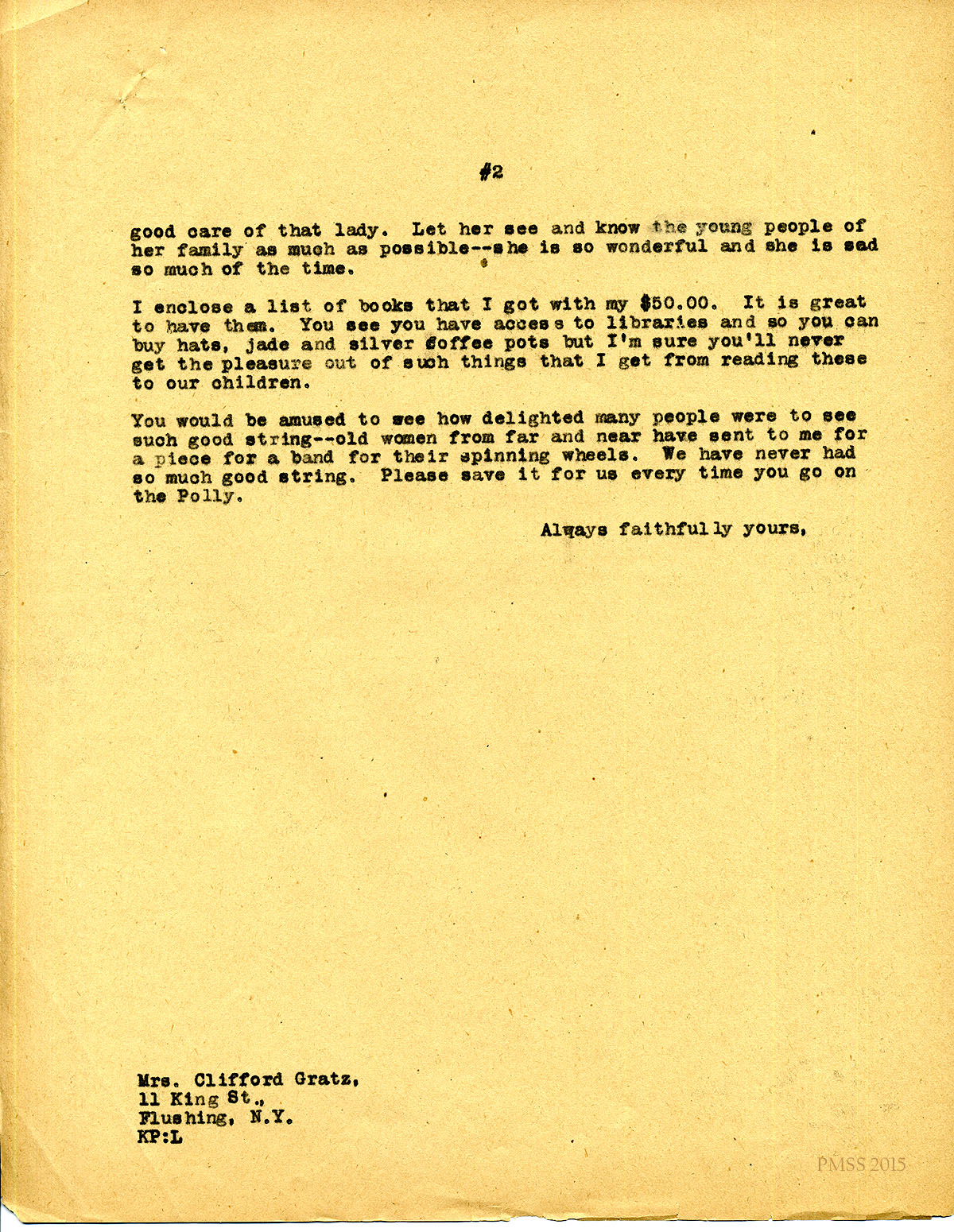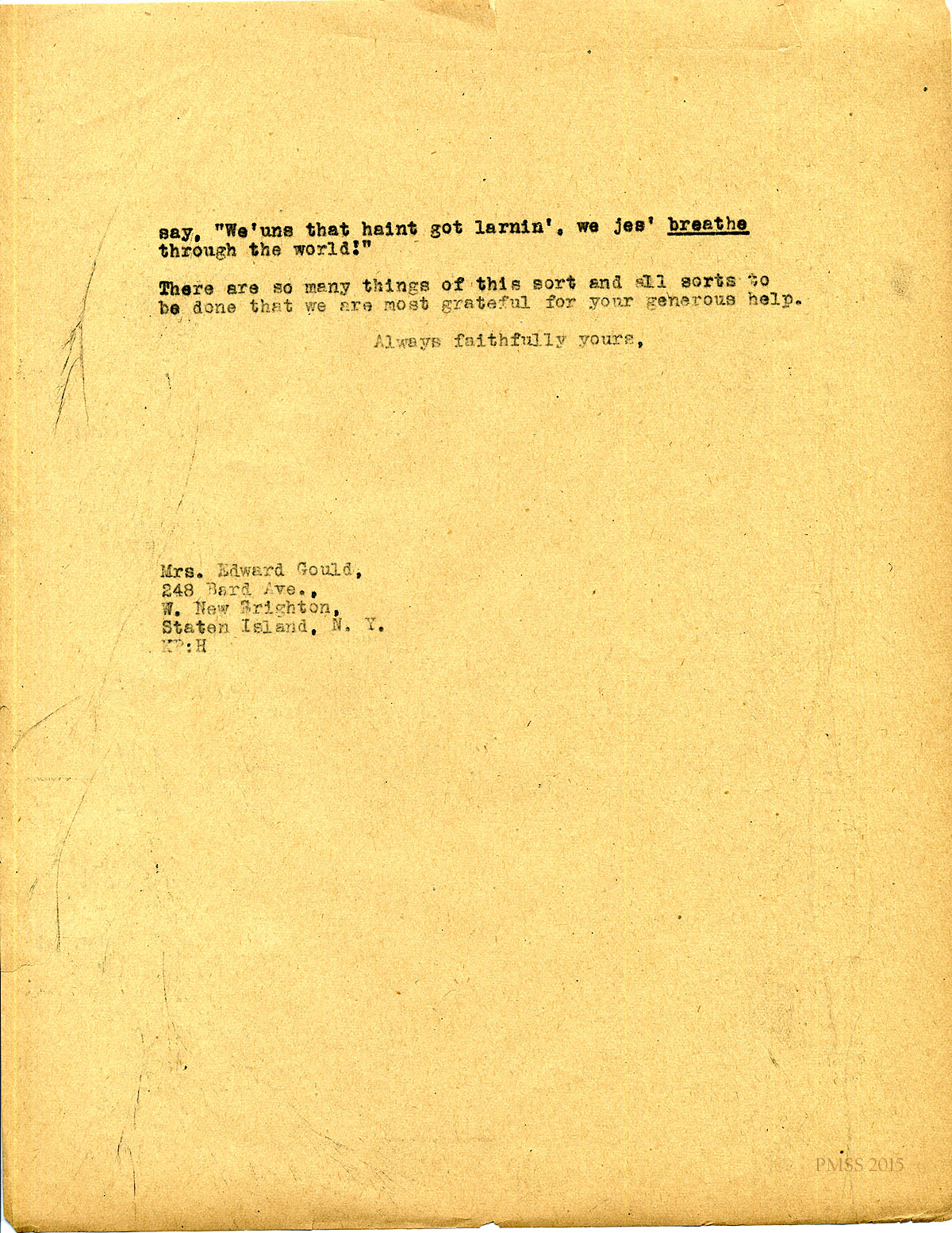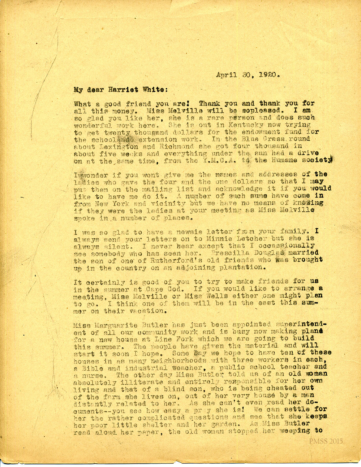 April 30, 1920. [unsigned] KP to Harriet White (Mrs. Edward Gould) Staten Island, NY. Cash gift; Miss Melville; mailing list names; Marguerite Butler’s work. [072-073]