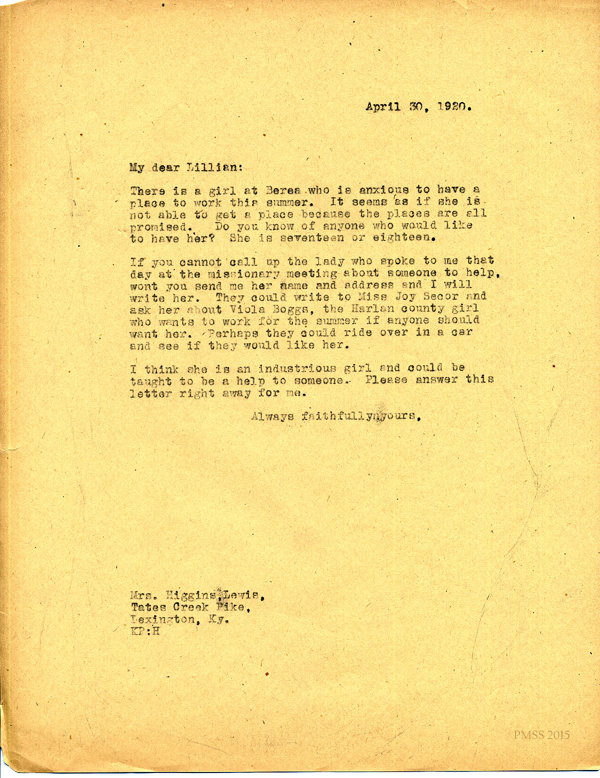 April 30, 1920. [unsigned] KP to “Lillian” (Mrs. Higgin Lewis), Lexington, KY. Looking for summer job for Berea girl, Viola Boggs. [074]