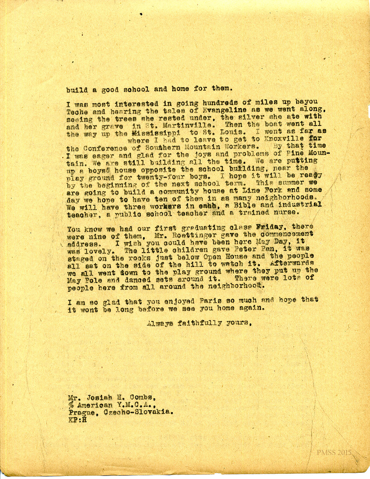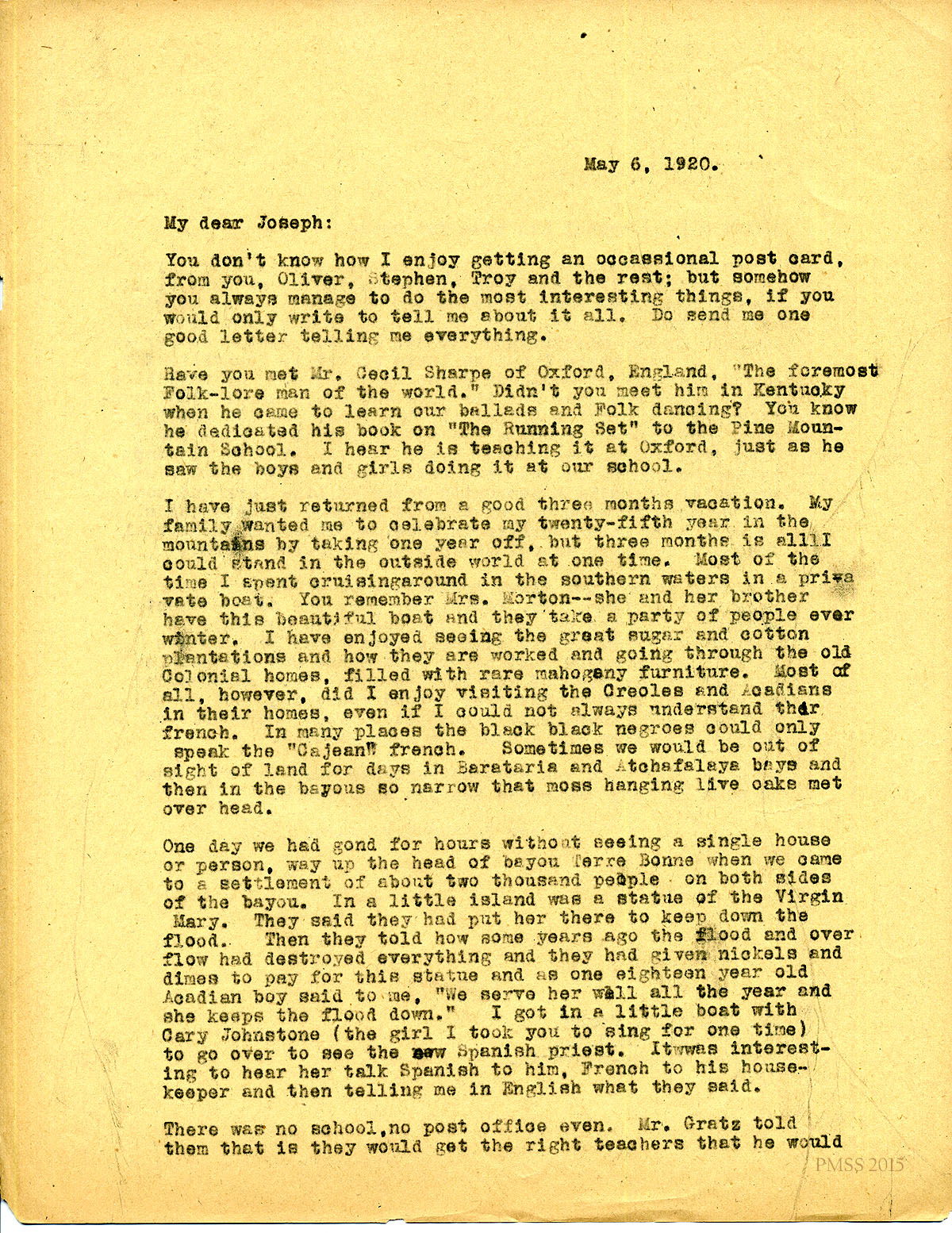 May 6, 1920. [unsigned] KP to “Joseph” (Josiah H. Cooke), Prague, Czecho-Slovakia. Cecil Sharpe; cruise; Cary Johnstone; Boy’s House; Line Fork; graduation. [077-078]