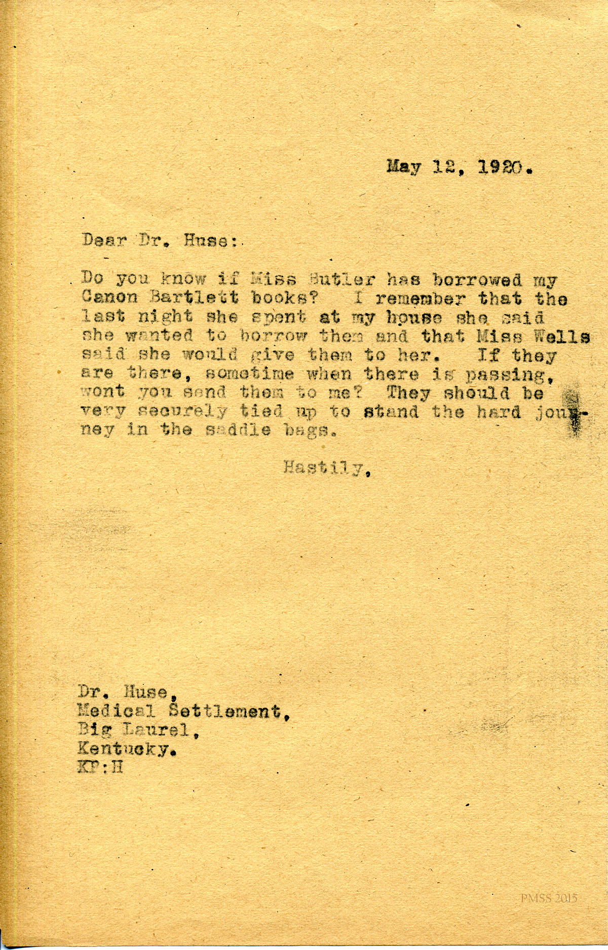 May 12, 1920. [unsigned] KP to Dr. Huse, Big Laurel (KY) Medical Settlement. Asks for return of Canon Bartlett books. [079]