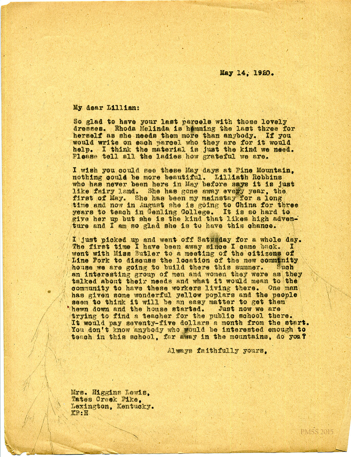 May 14, 1920. [unsigned] KP to “Lillian” (Mrs. Higgins Lewis), Lexington, KY. Thanks “ladies” for the material; Lilliath Robbins; meeting with Line Fork community. [080]