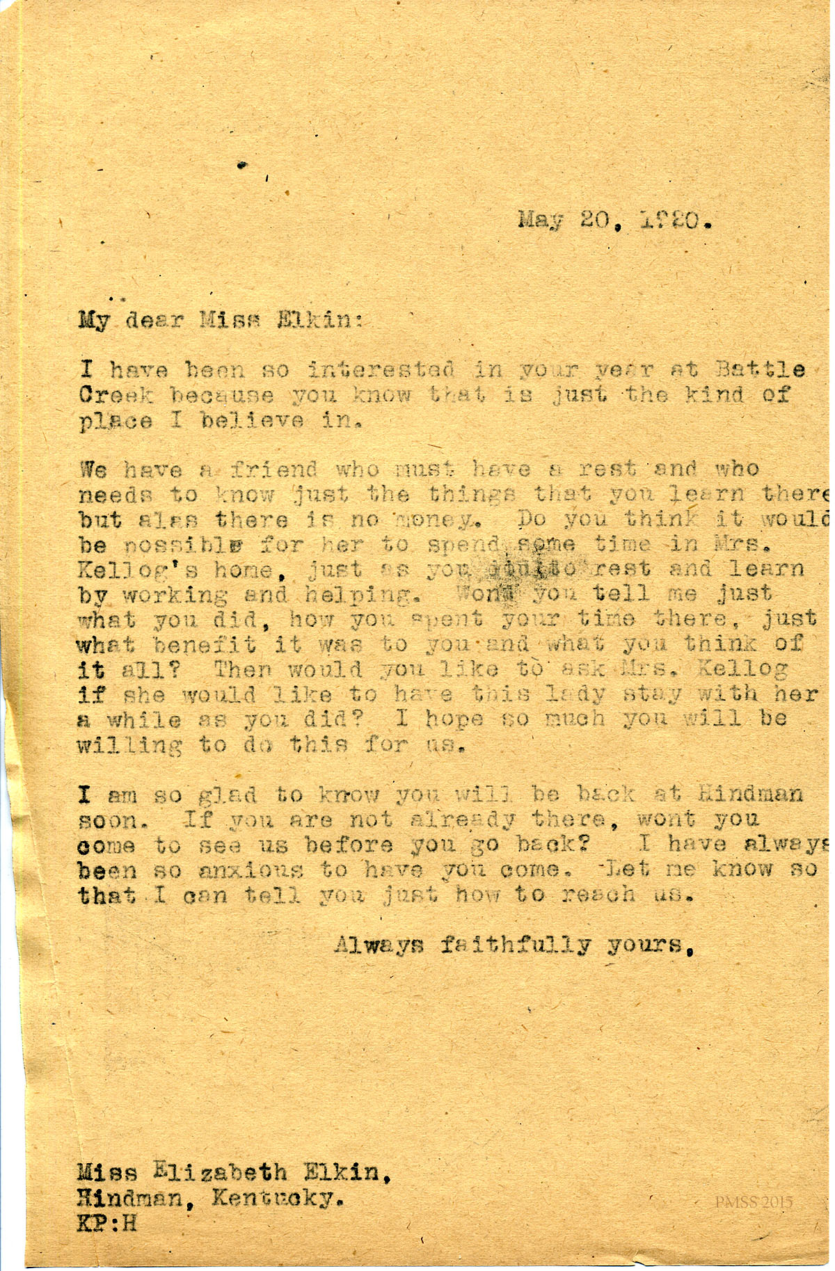 May 20, 1920. [unsigned] KP to Miss Elizabeth Elkin, Hindman, KY. Asks about Battle Creek. [081]