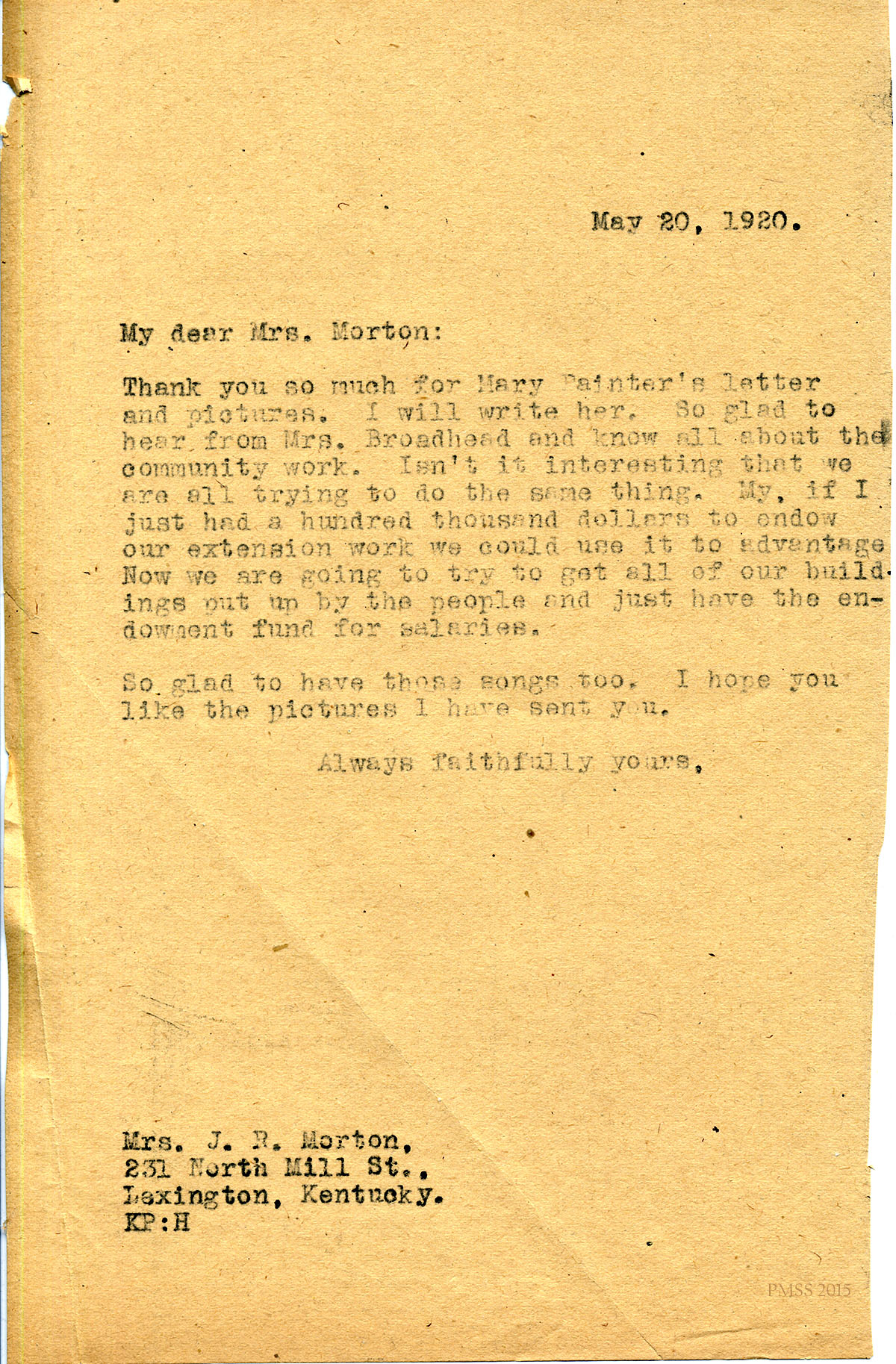 May 20, 1920. [unsigned] KP to Mrs. J. R. Horton, Lexington, KY. Thanks for Mary Painter’s letter and pictures; endowment fund. [082]