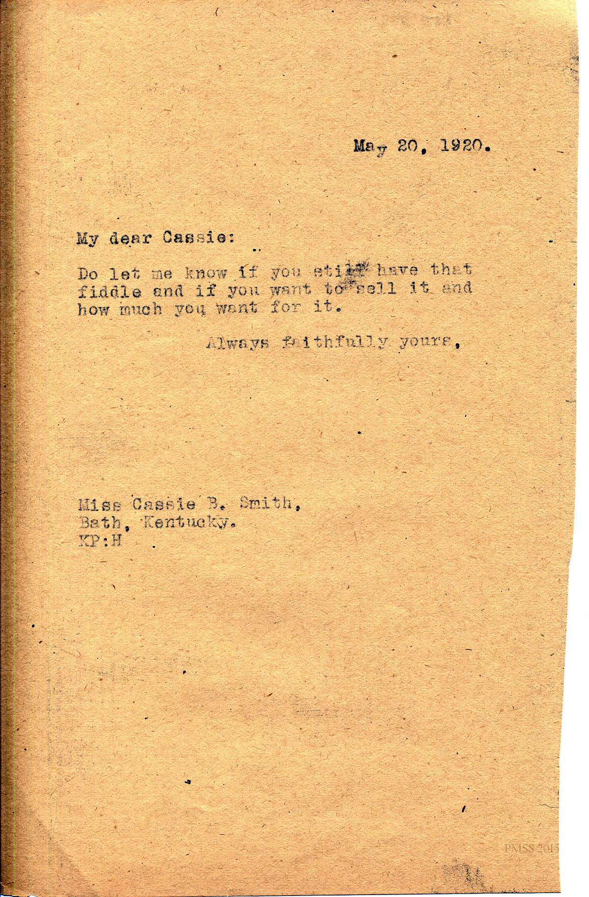 May 20, 1920. [unsigned] KP to Cassie B. Smith, Bath, KY. Interested in buying Cassie’s fiddle. [083]