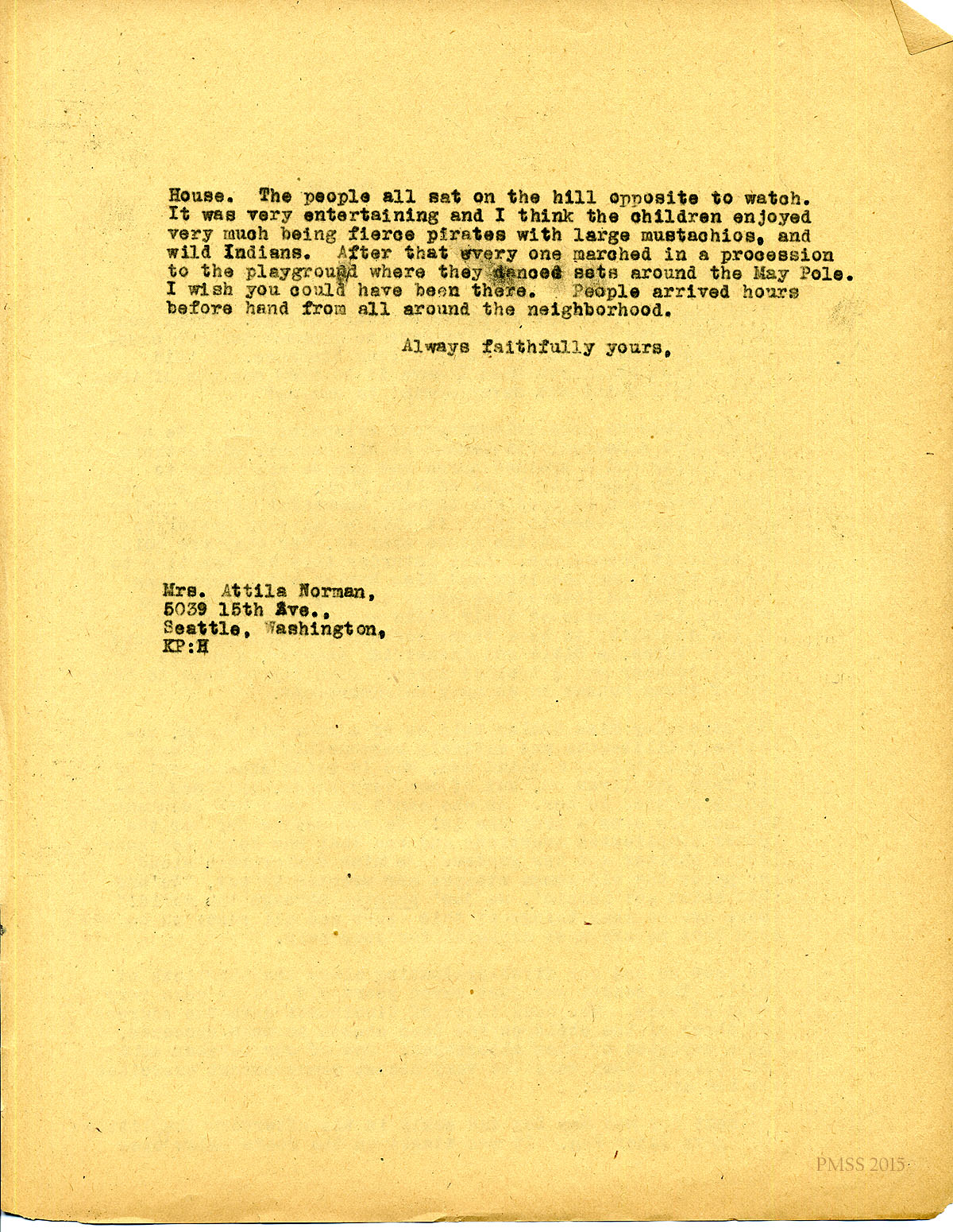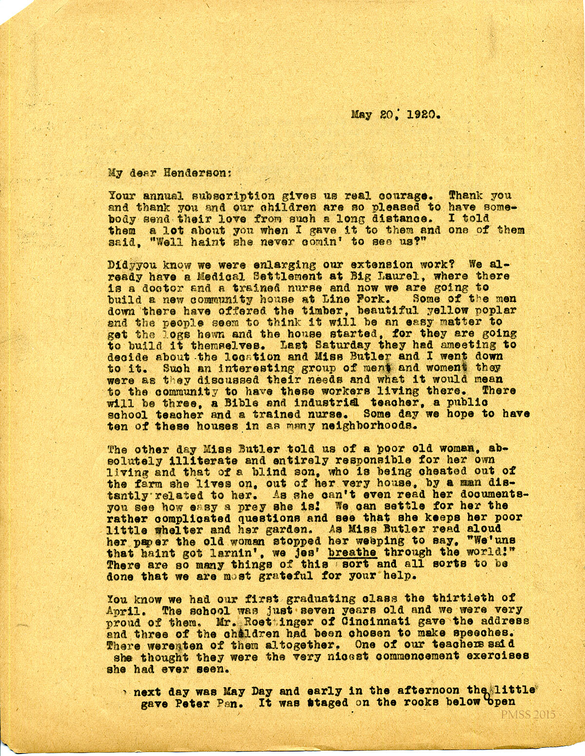 May 20, 1920. [unsigned] KP to ‘Henderson” (Mrs. Attila Norman), Seattle, WA. Annual subscription; Line Fork and Big Laurel; Mr. Roettinger; Peter Pan at May Day [084-085]