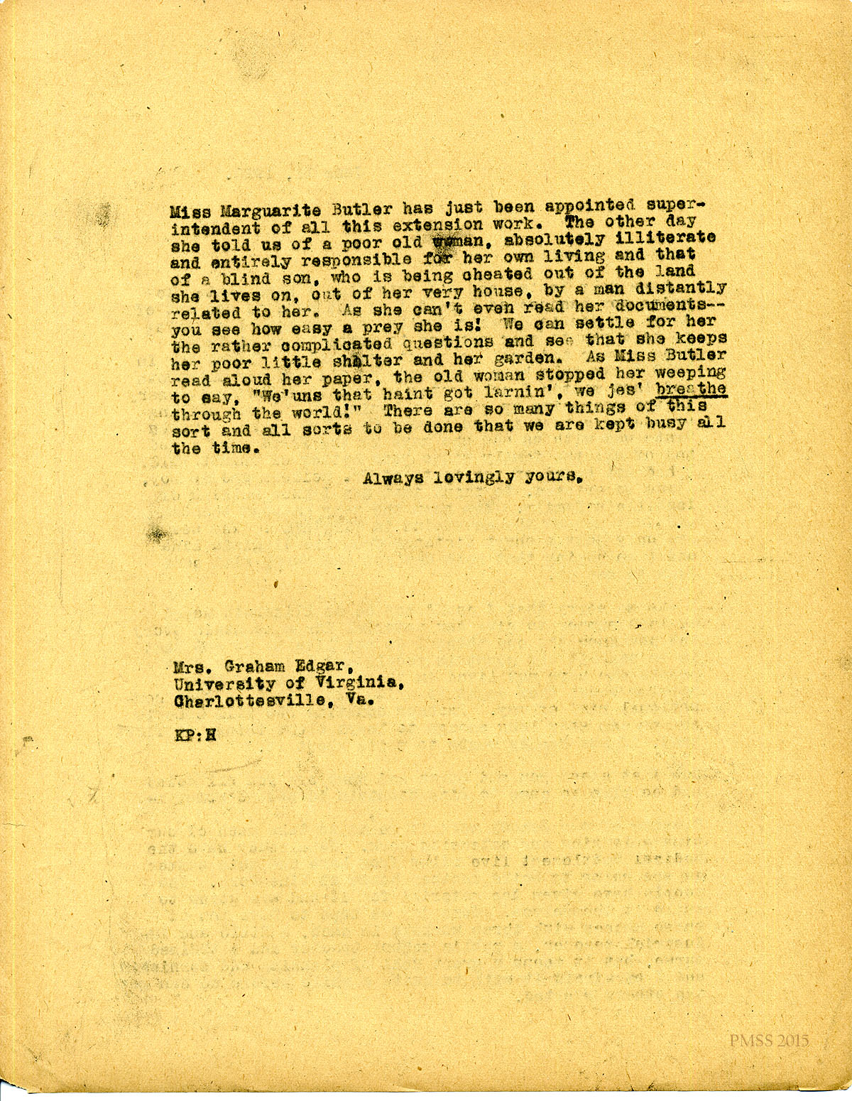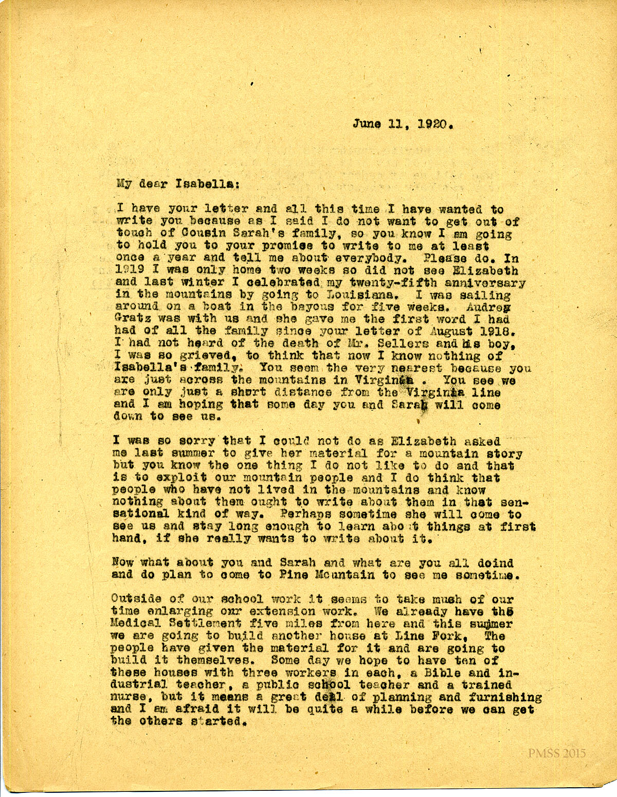 June 11, 1920. [unsigned] KP to “Isabella” (Mrs. Graham Edgar), Charlottesville, VA. Cousin Sarah; cruise; writing about mountain people; extension work. [086-087]