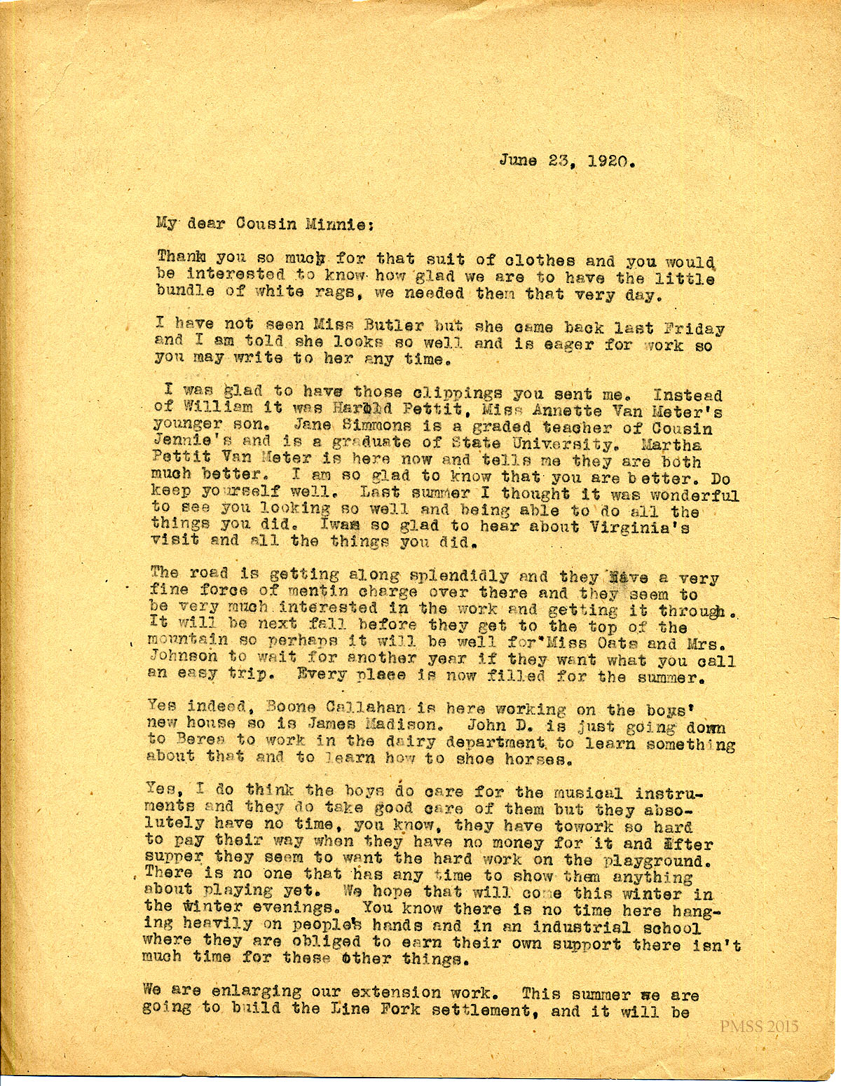 June 23, 1920. [unsigned] KP to “Cousin Minnie” (B.T. Atchison), Louisville, KY. Thanks for clothing; Harold Pettit; Jane Simmons; Martha Van Meter; the road; Boone Callahan; James Madison; extension work; Miss Gaines. [088-089]