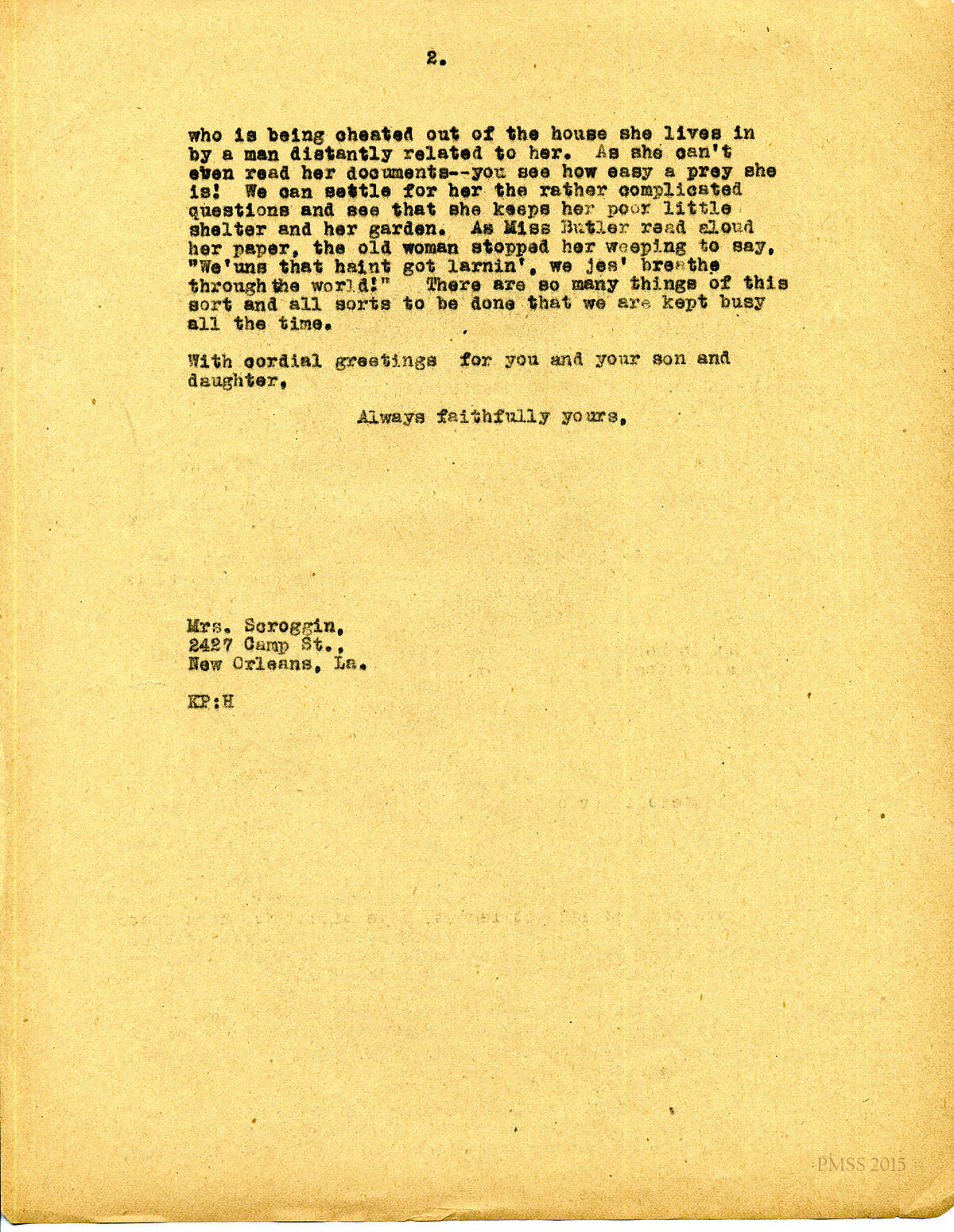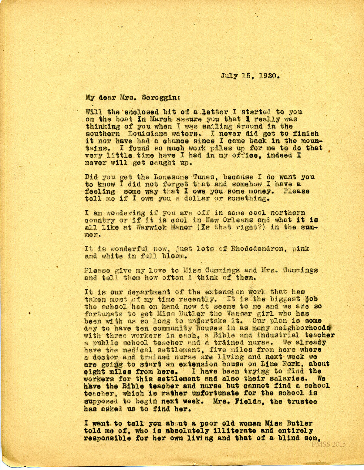 July 15, 1920. [unsigned] KP to Mrs. Scroggin, New Orleans, LA. Lonesome Tunes; extension work; Miss Butler. [094-095]