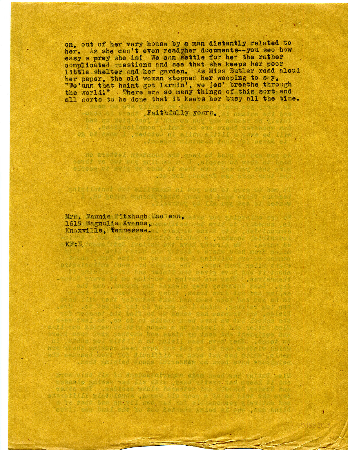 July 31, 1920. [unsigned] KP to “Nannie” (Mrs. Nannie Fitzhugh Maclean), Knoxville, TN. Community help with new extension. [096-097]