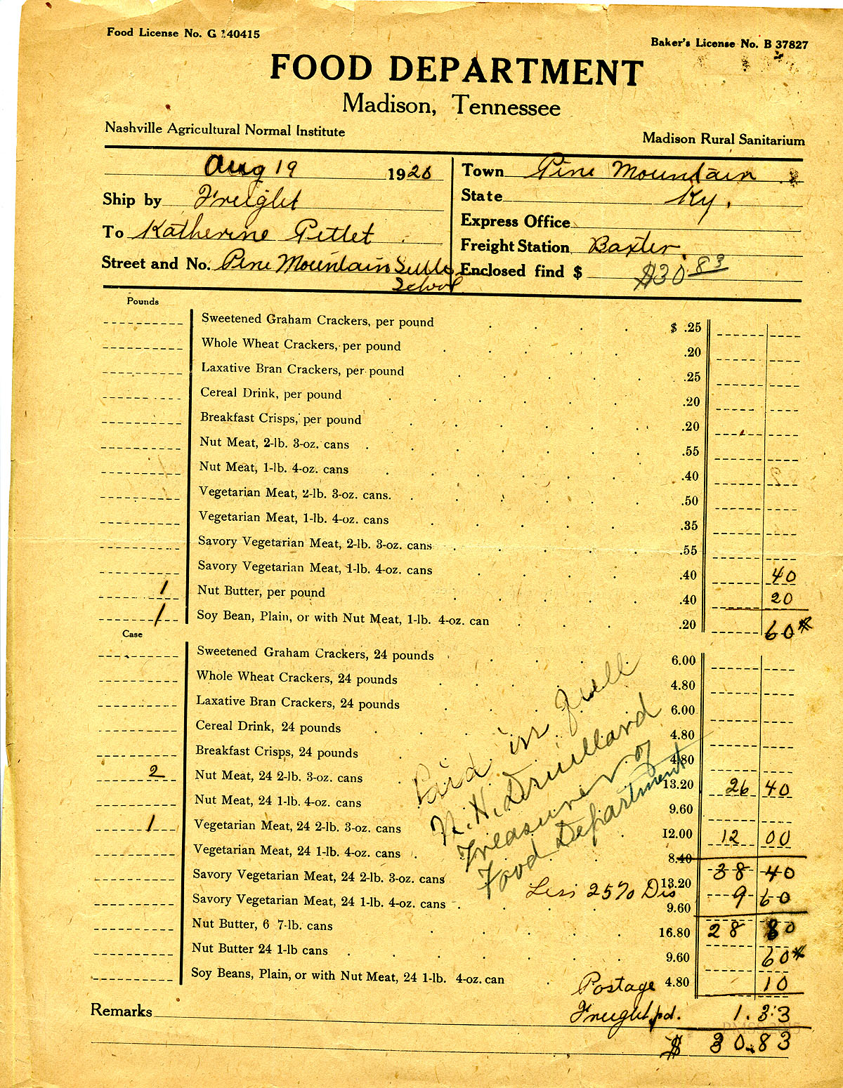 August 19, 1920. Freight Receipt from Food Department, Madison, TN, Nashville Agricultural Normal Institute, Madison Rural Sanitarium. [098-099]