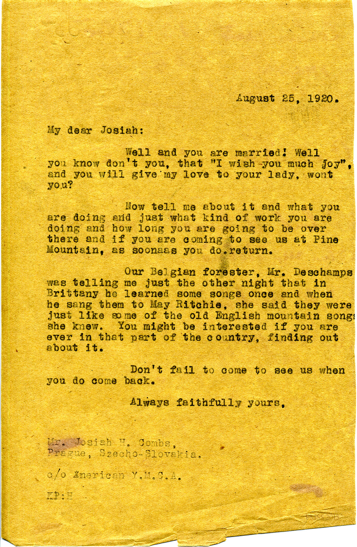 August 24, 1920. [unsigned] KP to Josiah N. Combs, Prague, Czecho-Slovakia. Invites him back to P.M.; Mr. Deschamps; May Ritchie; mountain songs. [100]