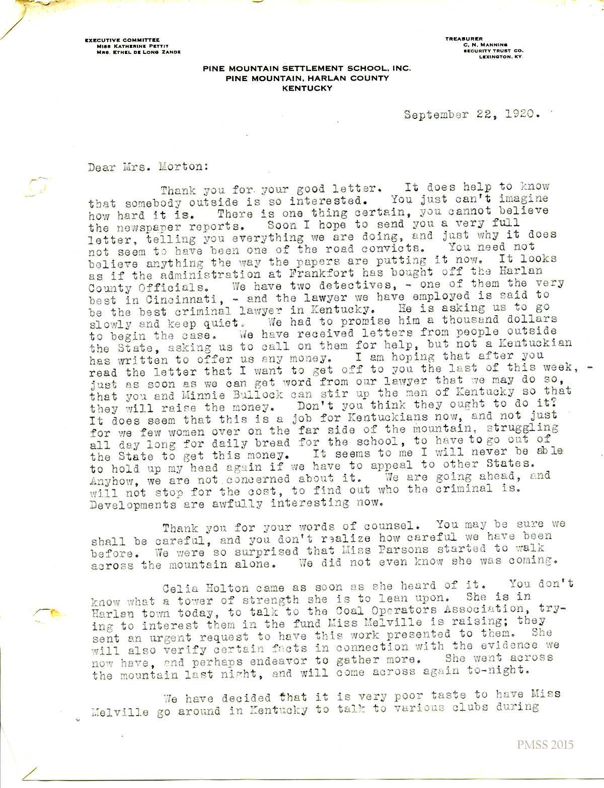 September 22, 1920. Katherine Pettit to Mrs. J. R. Morton, Harbor Springs, MI. Newspaper reports about Miss Parsons; lawyers; Celia Holton. [103-104]