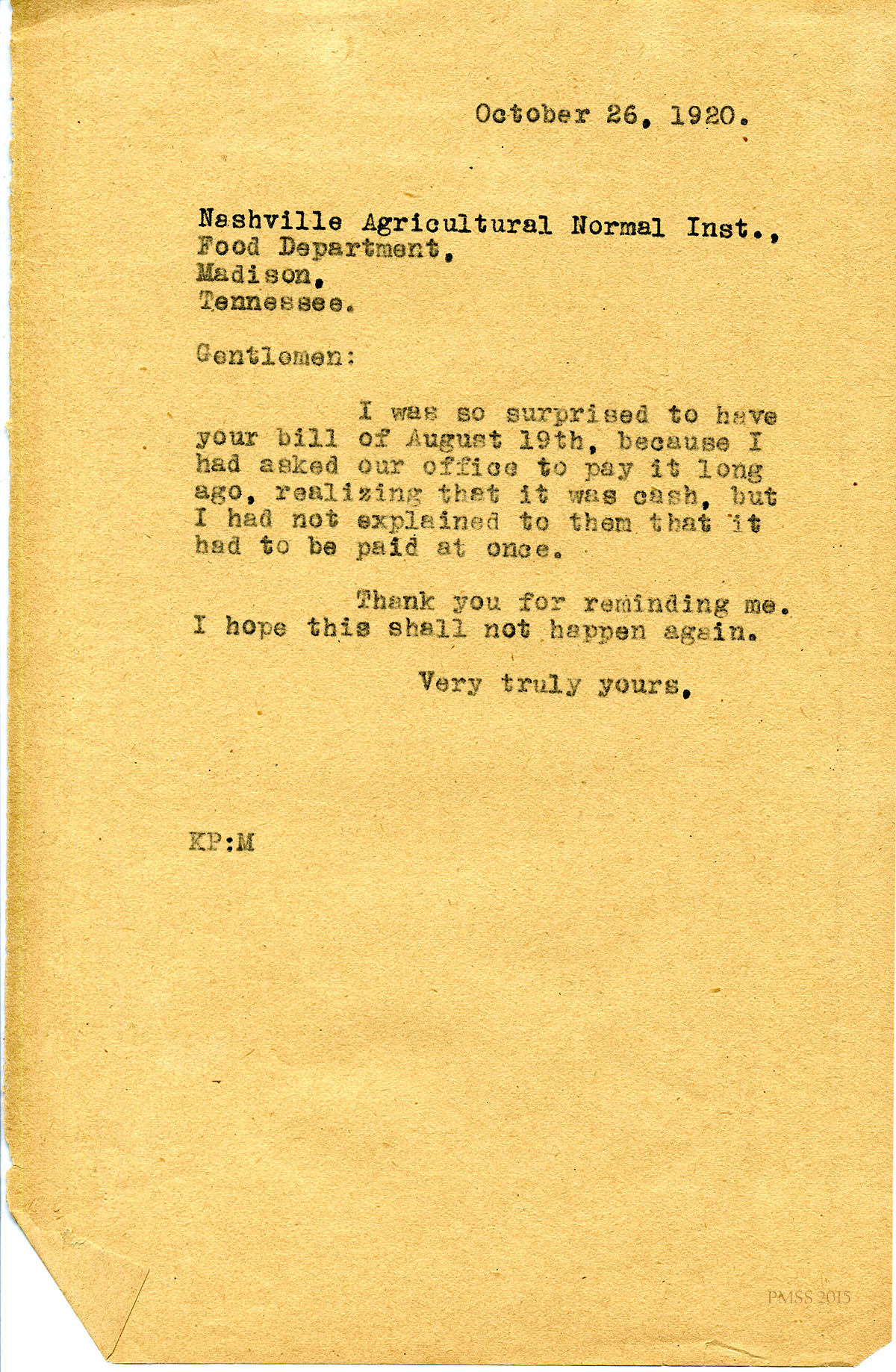 October 26, 1920. [unsigned] KP to “Gentlemen”, Nashville Agricultural Normal Inst., Food Dept, Madison, TN. Response to their billing. [105]