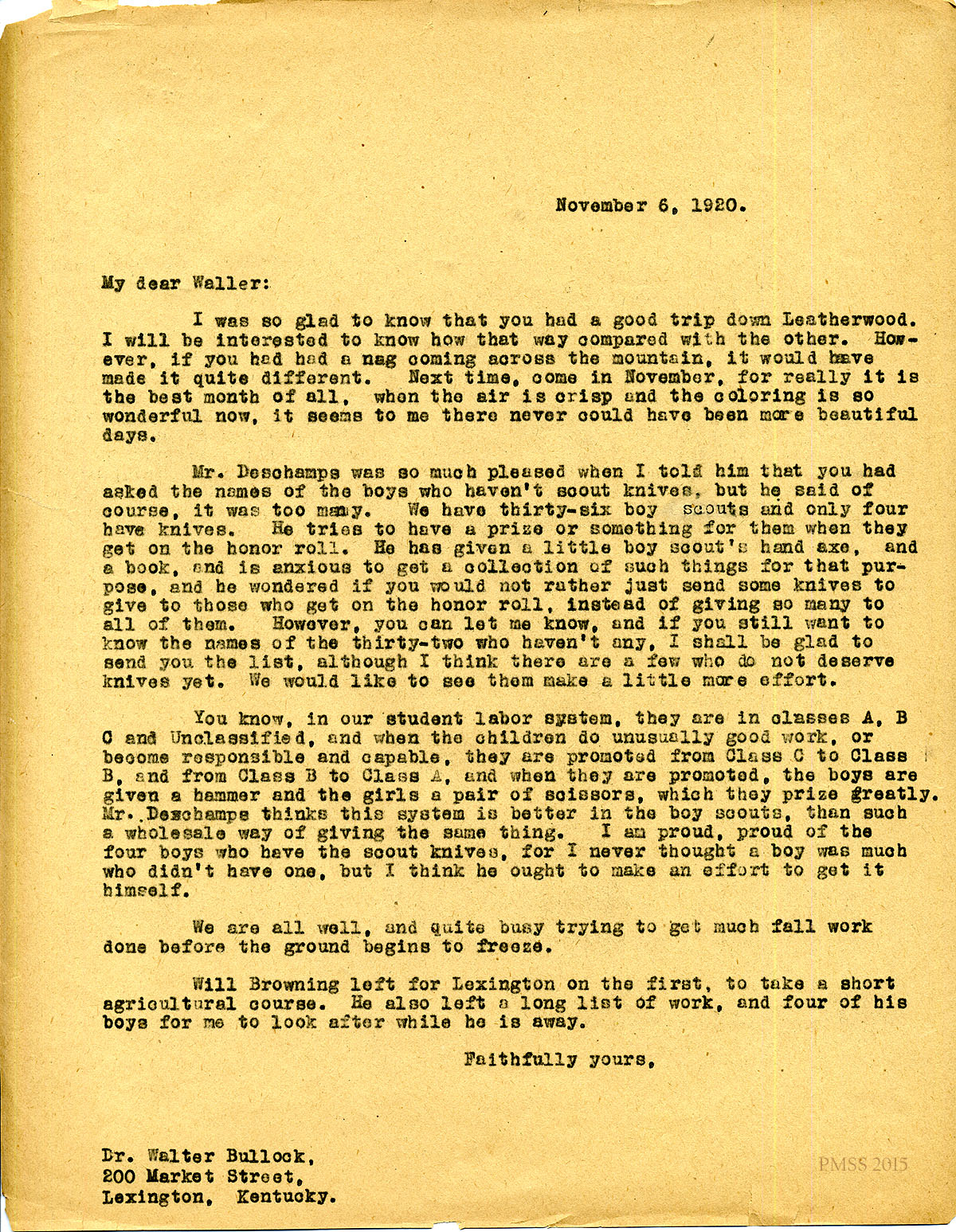 November 6, 1920. [unsigned] KP to “Waller” (Dr. Waller Bullock), Lexington, KY. Mr. Deschamps; Bullock’s offer of Scout knives; prizes to students; Will Browning. [106]