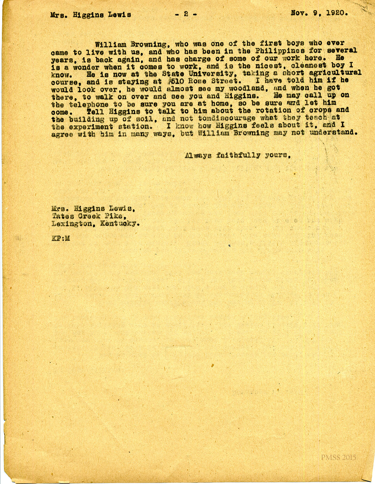 November 9, 1920. [unsigned] KP to “Lillian” (Mrs. Higgins Lewis), Lexington, KY. Thanks for dresses, food; clothing needs; Mary Winifred; William Browning. [107-108]